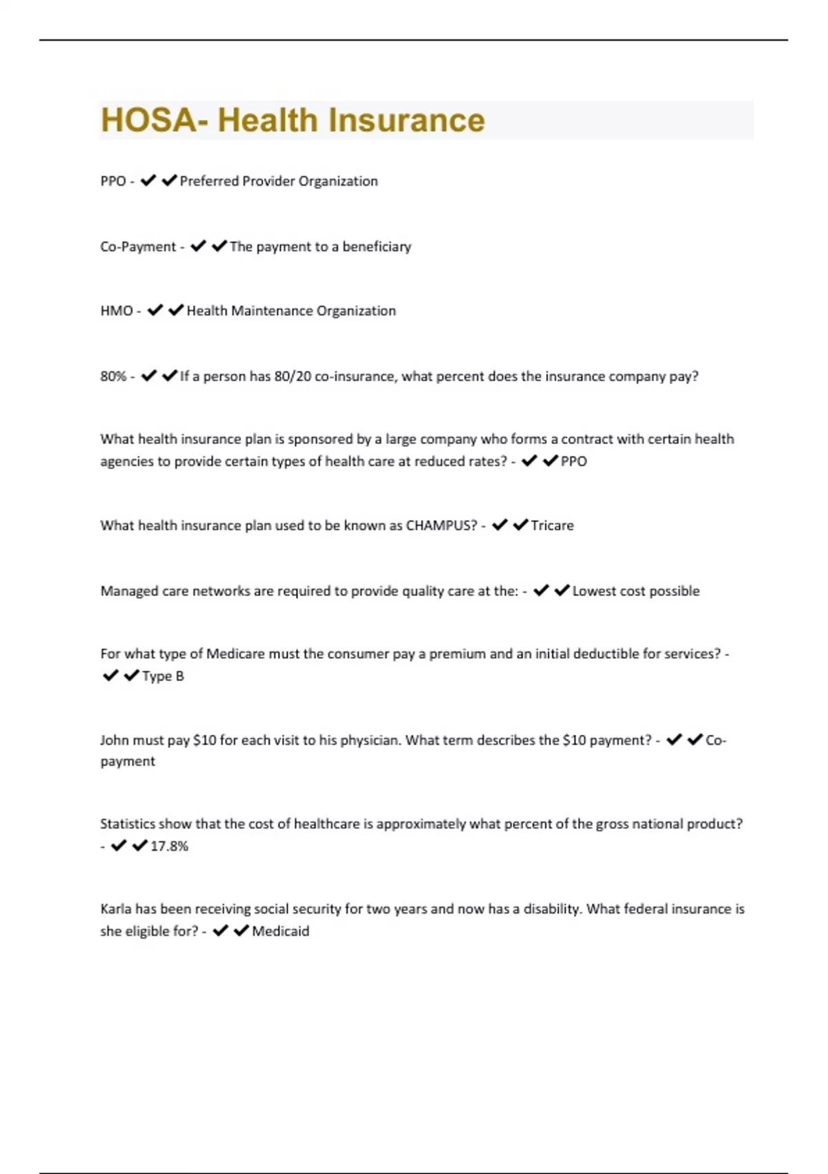 HOSA- Health Insurance Questions and Answers Solved Correctly
