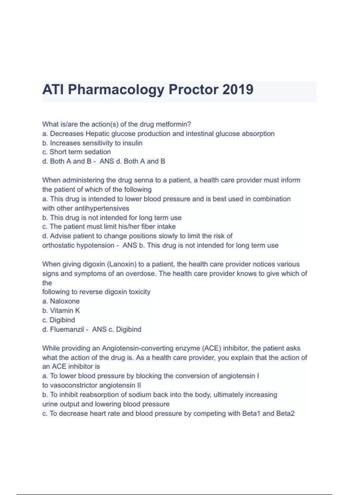 ATI PHARMACOLOGY 2019 PROCTORED EXAM QUESTIONS & ANSWERS (A+ GRADED 100% VERIFIED)
