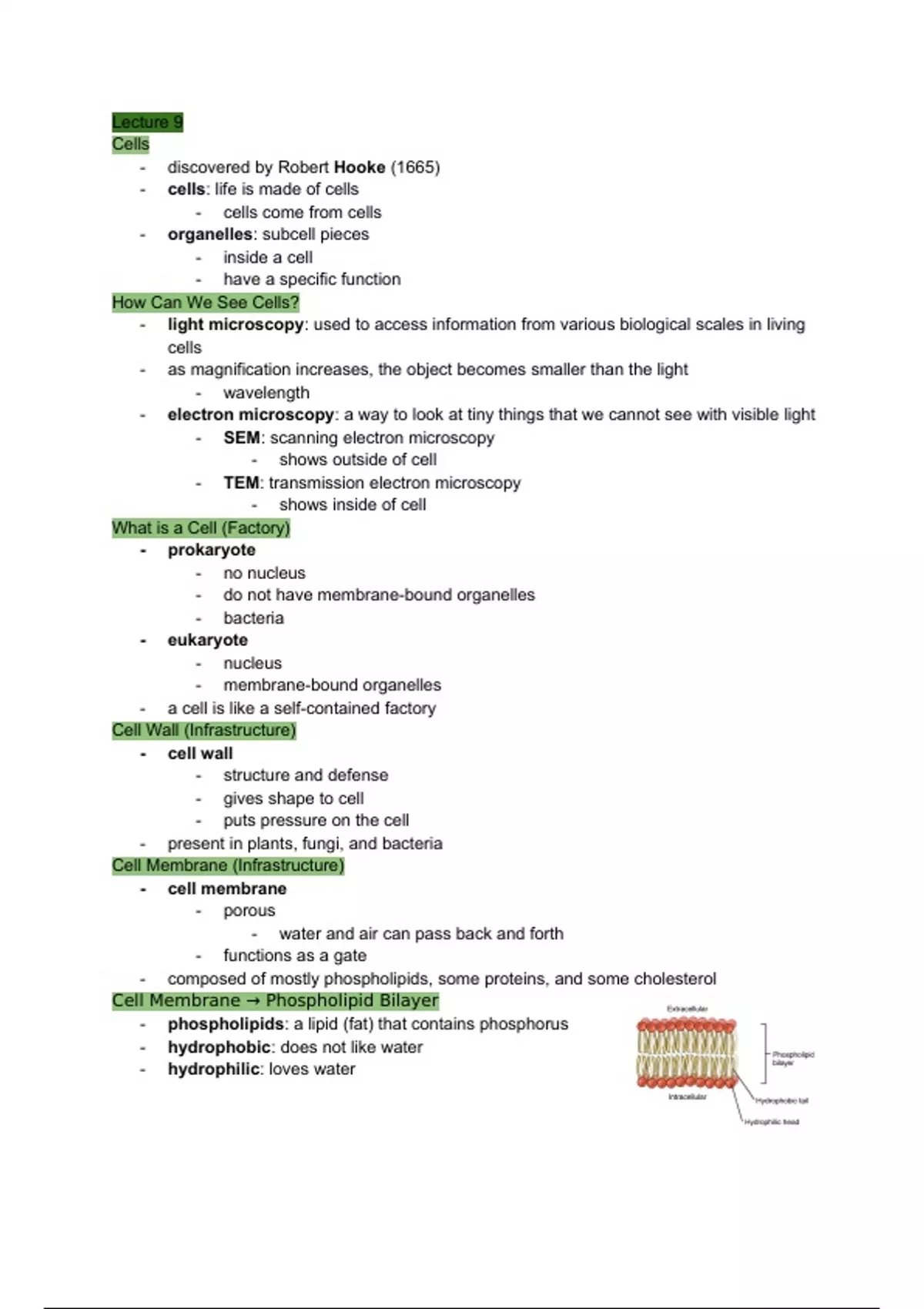 Lecture notes for Biology 105 entry-level lecture course. Includes notes from all lecture slides, important word definitions, and material for the second exam. Subjects included are cell structure and function, membranes, diffusion, osmosis, energy (ATP), cell respiration, glycolysis, fermentation, citric acid cycle, electron transportation chain, evolution, bacteria, domains, protist structure and function, and important vocabulary words.