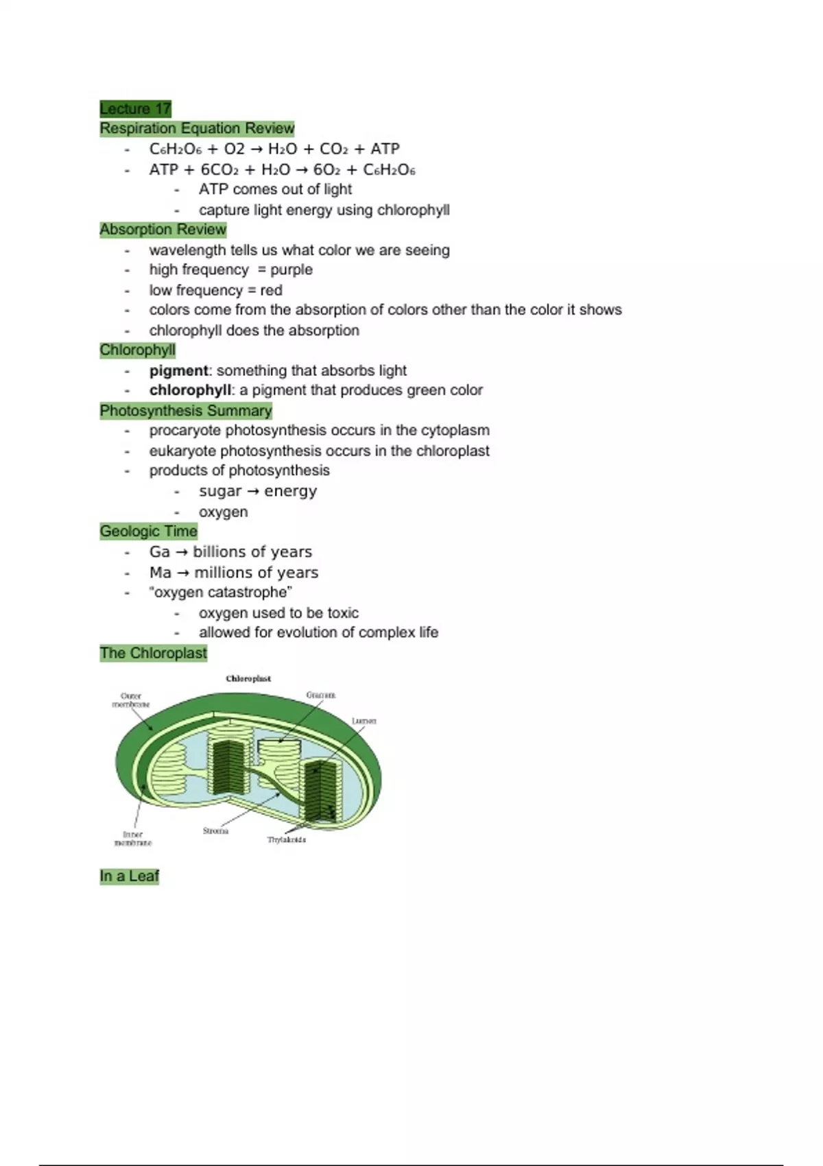Lecture notes for Biology 105 entry-level lecture course. Includes notes from all lecture slides, important word definitions, and material for the first exam. Subjects included are chloroplast structure and function, photosystems I and II, photosynthesis, the calvin cycle, cell division, chromosomes, the cell cycle, plant life cycle, yeast/mold/mushrooms, and important vocabulary.