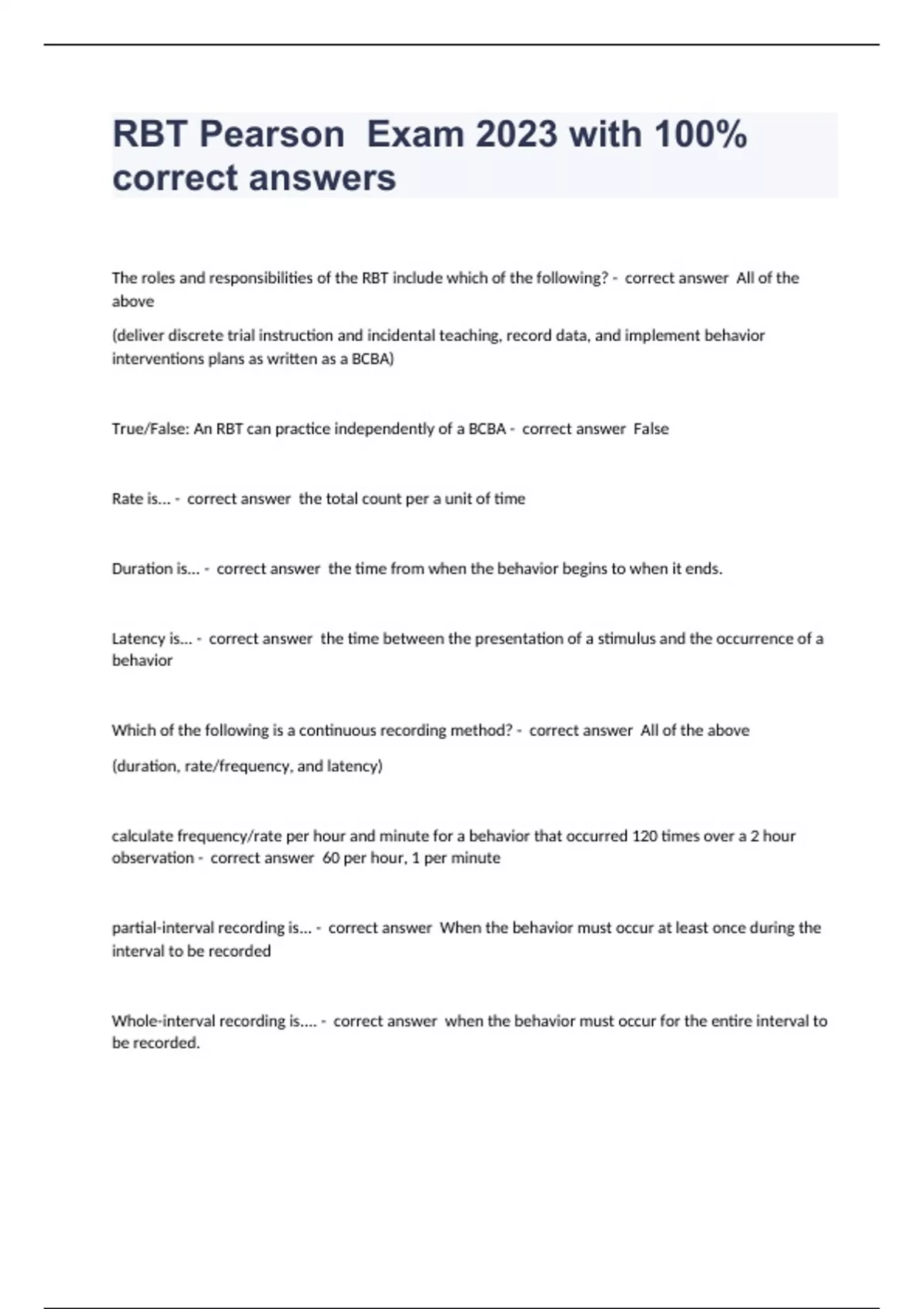 The roles and responsibilities of the RBT include which of the following? - correct answer All of the above (deliver discrete trial instruction and incidental teaching, record data, and implement behavior interventions plans as written as a BCBA) True/False: An RBT can practice independently of a BCBA - correct answer False Rate is... - correct answer the total count per a unit of time Duration is... - correct answer the time from when the behavior begins to when it ends. Latency is... - correct answer the time between the presentation of a stimulus and the occurrence of a behavior Which of the following is a continuous recording method? - correct answer All of the above (duration, rate/frequency, and latency) calculate frequency/rate per hour and minute for a behavior that occurred 120 times over a 2 hour observation - correct answer 60 per hour, 1 per minute partial-interval recording is... - correct answer When the behavior must occur at least once during the interval to be recorded Whole-interval recording is.... - correct answer when the behavior must occur for the entire interval to be recorded. Momentary time sampling is.... - correct answer when the behavior must be occurring at the end of the interval to be