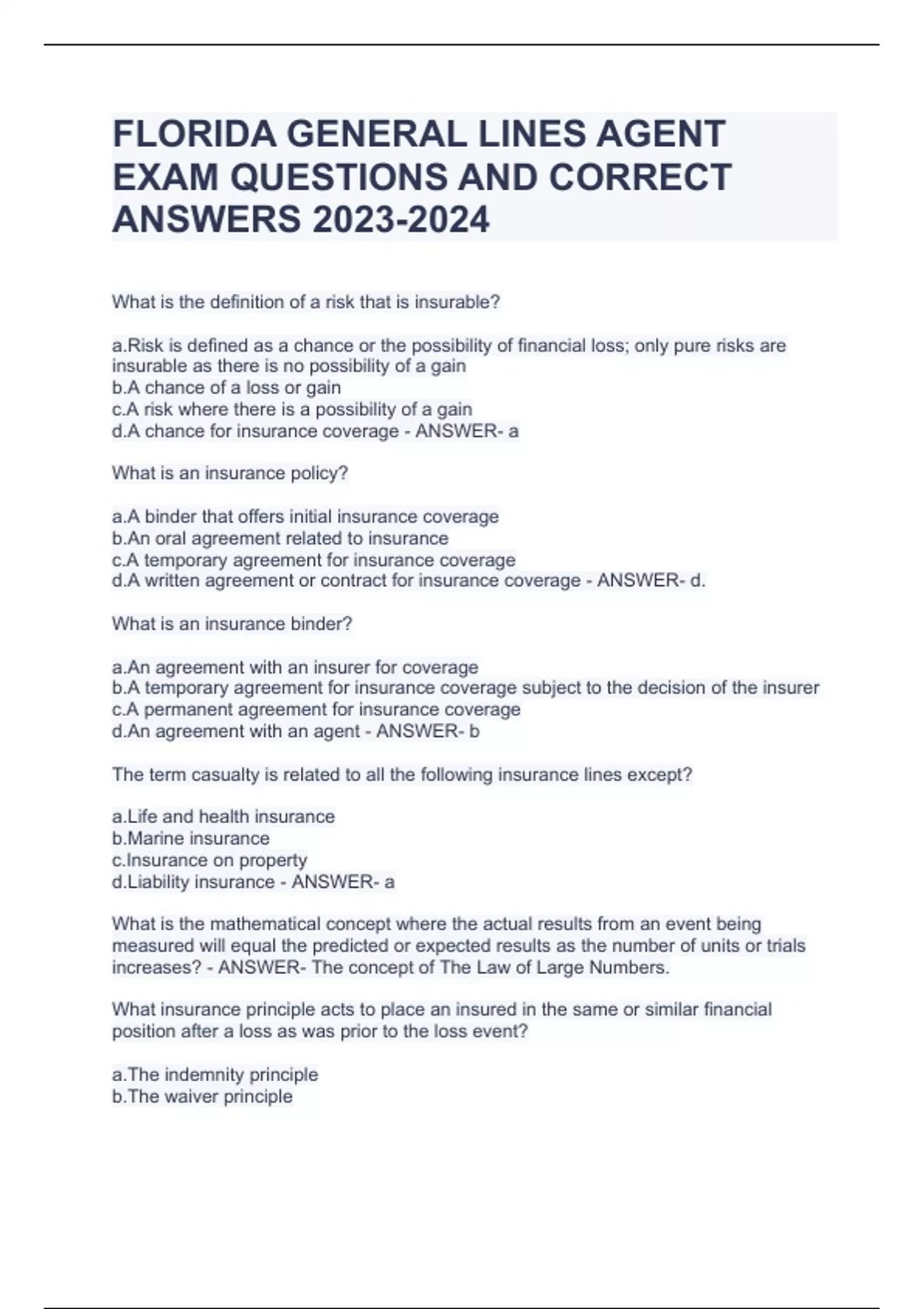 FLORIDA GENERAL LINES AGENT EXAM QUESTIONS AND CORRECT ANSWERS