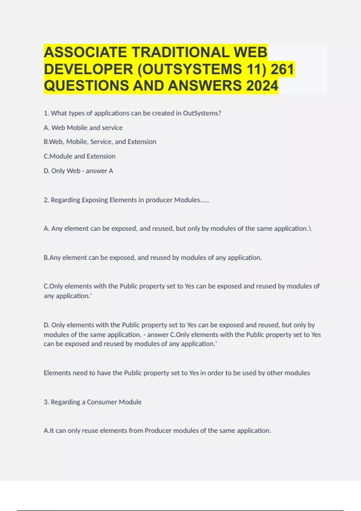 1. What types of applications can be created in OutSystems? A. Web Mobile and service B.Web, Mobile, Service, and Extension C.Module and Extension D. Only Web A 2. Regarding Exposing Elements in producer Modules..... A. Any element can be exposed, and reused, but only by modules of the same application. B.Any element can be exposed, and reused by modules of any application. C.Only elements with the Public property set to Yes can be exposed and reused by modules of any application.' D. Only elements with the Public property set to Yes can be exposed and reused, but only by modules of the same application. C.Only elements with the Public property set to Yes can be exposed and reused by modules of any application.' Elements need to have the Public property set to Yes in order to be used by other modules 3. Regarding a Consumer Module A.It can only reuse elements from Producer modules of the same application. B.It can only reuse elements that are Public in their Producer modules. C.It can reuse any element from any Producer module. D.It can only reuse elements from Producer modules of other applications B.It can only reuse elements that are Public in their Producer modules. Only Public elements in their modules can be reused by other modules in the environment. 4. Does OutSystems manage the underlying database tables for the developer? A.Yes B.No A.Yes Entites, attributes and indexes are automatically managed by the platform when modules are published. 5. Entities and Attributes are created in the database as ... A.Tables and Columns B.Tables and Indexes C.Indexes and Columns D.Tables and Constraints A 6. If an attribute is named "TotalCount", OutSystems will automatically set its data type to ... A. Text B.Integer C.Boolean D.Date B.Integer Data types are inferred automatically based on the name. *Count maps to Integer. 7. Entities are created with a set of Entity Actions for CRUD operations, which ones? A. Insert,Update,Delete B. Create, CreateOrUpdate, Update, Get, GetForUpdate, Delete C.GET, POST, DELETE D.Add, Change, Remove B. Create, CreateOrUpdate, Update, Get, GetForUpdate, Delete Entities defined in OutSystems have these entity actions. In the case of a Static Entity only the Get entity action is provided. 8. Input parameters are always mandatory A.True B.False B.False Input parameters can be set as mandatory thru the Is Mandatory property. 9. Output parameters are available ... A.Only inside their implementation scope. B.Only outside their implementation scope. C.Both inside and outside their implementation scope. C.Both inside and outside their implementation scope. A value must be assigned to the Output Parameter inside to be returned to the outside. 10. A Structure can have attributes of the following data types: A.Basic, Complex, and Record B.Basic, String, and Object C.Basic, Structure, Entity, and List D.Basic and List only C.Basic, Structure, Entity, and List These are the selected four. Don't forget that within Basic we have Text, Integer, Email, Currency, ... 11. A list in OutSystems is .... A. Collection with the same data type B.A collection of elements with different data types A. Collection with the same data type Lists in OutSystems are homogeneous, meaning that all elements have the same data type 12. Does OutSystems manage the underlying database tables for the developer? A.Yes B.No A.Yes Entites, attributes and indexes are automatically managed by the platform when modules are published. 13. Entities and Attributes are created in the database as ... A.Tables and Columns B.Tables and Indexes C.Indexes and Columns D.Tables and Constraints A 14. If an attribute is named "TotalCount", OutSystems will automatically set its data type to ... A. Text B.Integer C.Boolean D.Date B.Integer Data types are inferred automatically based on the name. *Count maps to Integer. 15. Entities are created with a set of Entity Actions for CRUD operations, which ones? A. Insert,Update,Delete B. Create, CreateOrUpdate, Update, Get, GetForUpdate, Delete C.GET, POST, DELETE D.Add, Change, Remove B. Create, CreateOrUpdate, Update, Get, GetForUpdate, Delete Entities defined in OutSystems have these entity actions. In the case of a Static Entity only the Get entity action is provided. 16. In the screen lifecycle, the preparation runs on the browser A.True B.False B.False Preparation contains server-side logic, that is executed before rendering the screen 17. What does the Widget Tree represent? A.The screen lifecycle flow B.The hierarchy of the widgets on the screen C.A list of application screens D.The existing screen templates B.The hierarchy of the widgets on the screen The tree-like structure shown in the Widget Tree allows developers to see and fine tune the screen structure 18. What type of variables can be created inside a Screen? A.Local Variables B.Input Parameters only C.Input Parameters and Local Variables D.Input parameters, output parameters, and local variables C.Input Parameters and Local Variables Right! Screens do not have Output Parameters. 19. What is the main purpose of Screen Preparation? A. Decide what widgets will be rendered. B.fetch data from databases. C.Submit the form data to the server D.Redirect the user to proper screen B.fetch data from databases. The data needed to help rendering a screen is obtained using the screen Preparation. 20. What types of applications can be created in OutSystems? A. Web Mobile and service B.Web, Mobile, Service, and Extension C.Module and Extension D. Only Web A 21. Regarding Exposing Elements in producer Modules..... A. Any element can be exposed, and reused, but only by modules of the same application. B.Any element can be exposed, and reused by modules of any application. C.Only elements with the Public property set to Yes can be exposed and reused by modules of any application.' D. Only elements with the Public property set to Yes can be exposed and reused, but only by modules of the same application. C.Only elements with the Publi