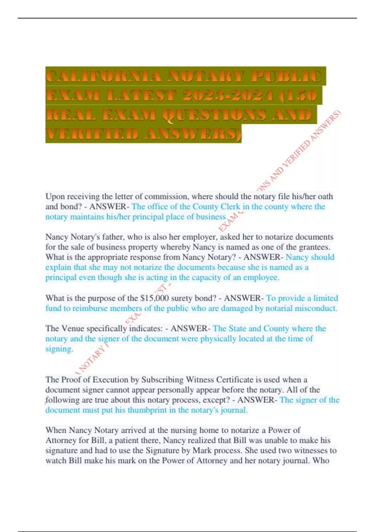 CALIFORNIA NOTARY PUBLIC EXAM LATEST (150 REAL EXAM QUESTIONS AND VERIFIED ANSWERS) Upon receiving the letter of commission, where should the notary file his/her oath and bond? - ANSWER- The office of the County Clerk in the county where the notary maintains his/her principal place of business Nancy Notary's father, who is also her employer, asked her to notarize documents for the sale of business property whereby Nancy is named as one of the grantees. What is the appropriate response from Nancy Notary? - ANSWER- Nancy should explain that she may not notarize the documents because she is named as a principal even though she is acting in the capacity of an employee. What is the purpose of the $15,000 surety bond? - ANSWER- To provide a limited fund to reimburse members of the public who are damaged by notarial misconduct. The Venue specifically indicates: - ANSWER- The State and County where the notary and the signer of the document were physically located at the time of signing. The Proof of Execution by Subscribing Witness Certificate is used when a document signer cannot appear personally appear before the notary. All of the following are true about this notary process, except? - ANSWER- The signer of the document must put his thumbprint in the notary's journal. When Nancy Notary arrived at the nursing home to notarize a Power of Attorney for Bill, a patient there, Nancy realized that Bill was unable to make his signature and had to use the Signature by Mark process. She used two witnesses to watch Bill make his mark on the Power of Attorney and her notary journal. Who must write Bill's name and sign his or her name in the journal next to Bill's mark? - ANSWER- The witness who wrote Bill's name next to Bill's mark on the document or the notary. Which of the following notaries can notarize a document even if he or she is gaining financial compensation from the transaction? - ANSWER- None of the above Which document must the notary notarize for free? - ANSWER- document relating to nomination for public office Marilyn will not be renewing her commission. What must she do with her Notary seal? - ANSWER- Deface or destroy the seal Nancy notary is also an escrow officer; she earns a bonus from her company for processing the sale of a property for one of the clients. She may: - ANSWER- notarize the document involving this transaction. Who may request a certified copy of a notary's journal entry? - ANSWER- Secretary of State When an advertisement in Spanish says "Notario Publico," what is the maximum the advertising notary can be fined? - ANSWER- $1500 Robin is a Notary employed by the Acme Law Firm for the last 25 years. He is ready to retire and resign from his notary commission. What must he do with his notary journal? - ANSWER- Turn in the journal to the County Clerk's office where his oath and bond are filed. Alissa is a non-attorney notary and a qualified, bonded immigration specialist. How much can Alissa charge to help one individual complete immigration forms? - ANSWER- $15 When notarizing a foreign language document that you cannot read, as a notary you must: - ANSWER- make sure the document is complete and describe it in the journal as a "foreign language document." Linda is called to the UC Davis Burn Unit to notarize a Power of Attorney for Timothy. The head nurse in charge of Timothy's care limits the number of people in Timothy's room. Since he is burned on 80% of his body and does not have specified paper identification, how must Linda proceed since she does not know anyone who is present? - ANSWER- Use two credible witnesses who have their specified paper identification documents.
