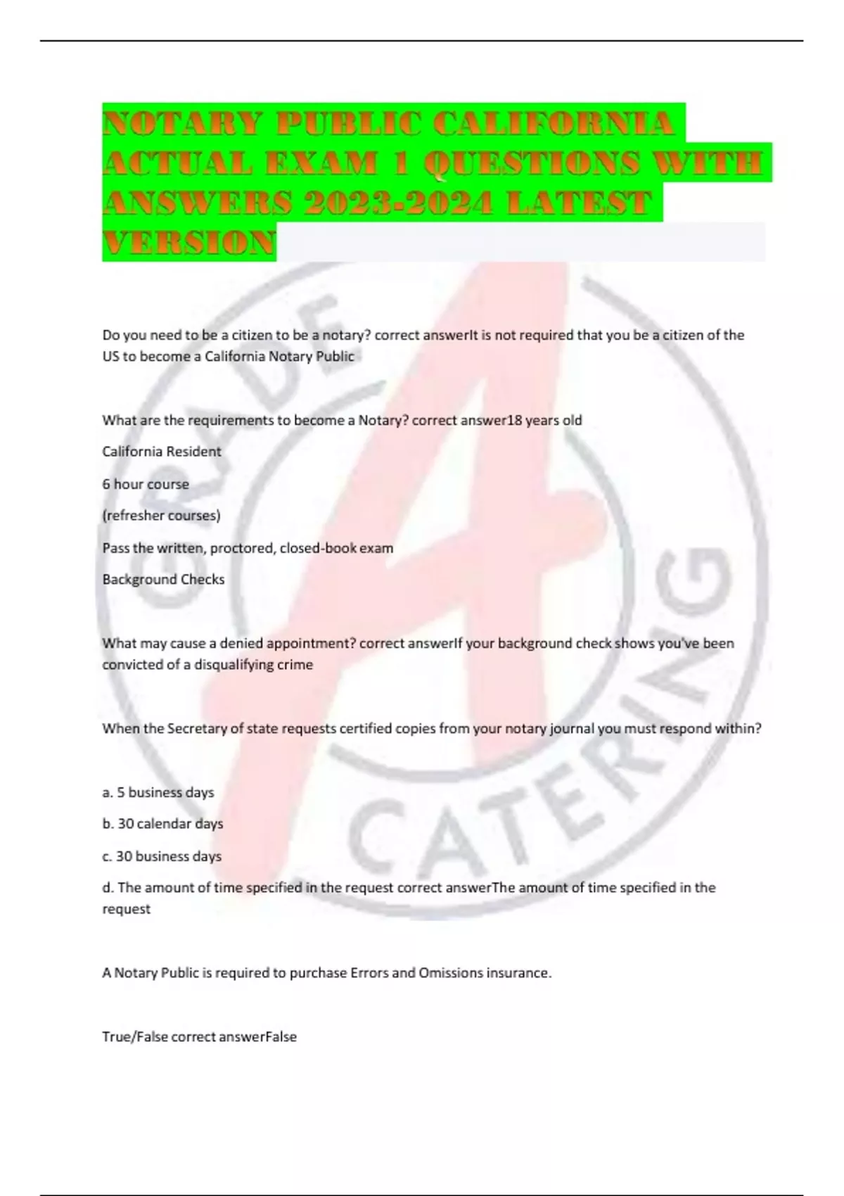 NOTARY PUBLIC CALIFORNIA ACTUAL EXAM 1 QUESTIONS WITH ANSWERS LATEST VERSION Do you need to be a citizen to be a notary? correct answerIt is not required that you be a citizen of the US to become a California Notary Public What are the requirements to become a Notary? correct answer18 years old California Resident 6 hour course (refresher courses) Pass the written, proctored, closed-book exam Background Checks What may cause a denied appointment? correct answerIf your background check shows you've been convicted of a disqualifying crime When the Secretary of state requests certified copies from your notary journal you must respond within? a. 5 business days b. 30 calendar days c. 30 business days d. The amount of time specified in the request correct answerThe amount of time specified in the request A Notary Public is required to purchase Errors and Omissions insurance. True/False correct answerFalse If you currently hold a notary commission, you do not need to complete the Notary Public Application to apply for a new commission.