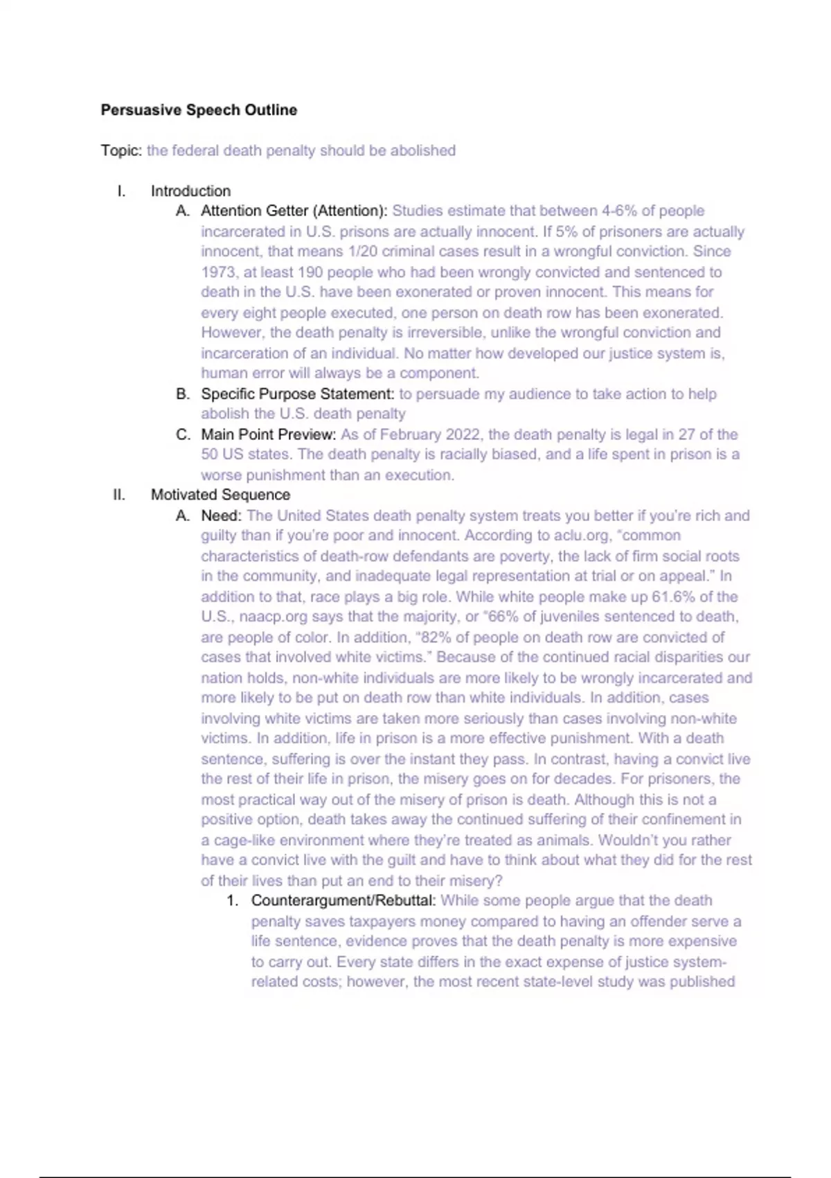 Document including a complete outline and references for a persuasive speech. Included in the outline are the attention grabber, introduction, motivated sequence (need, argument, counter-argument, rebuttal, solution, visualization, and action), conclusion, and closing statement. The persuasive topic I chose for this outline was to abolish the death penalty in all US states.