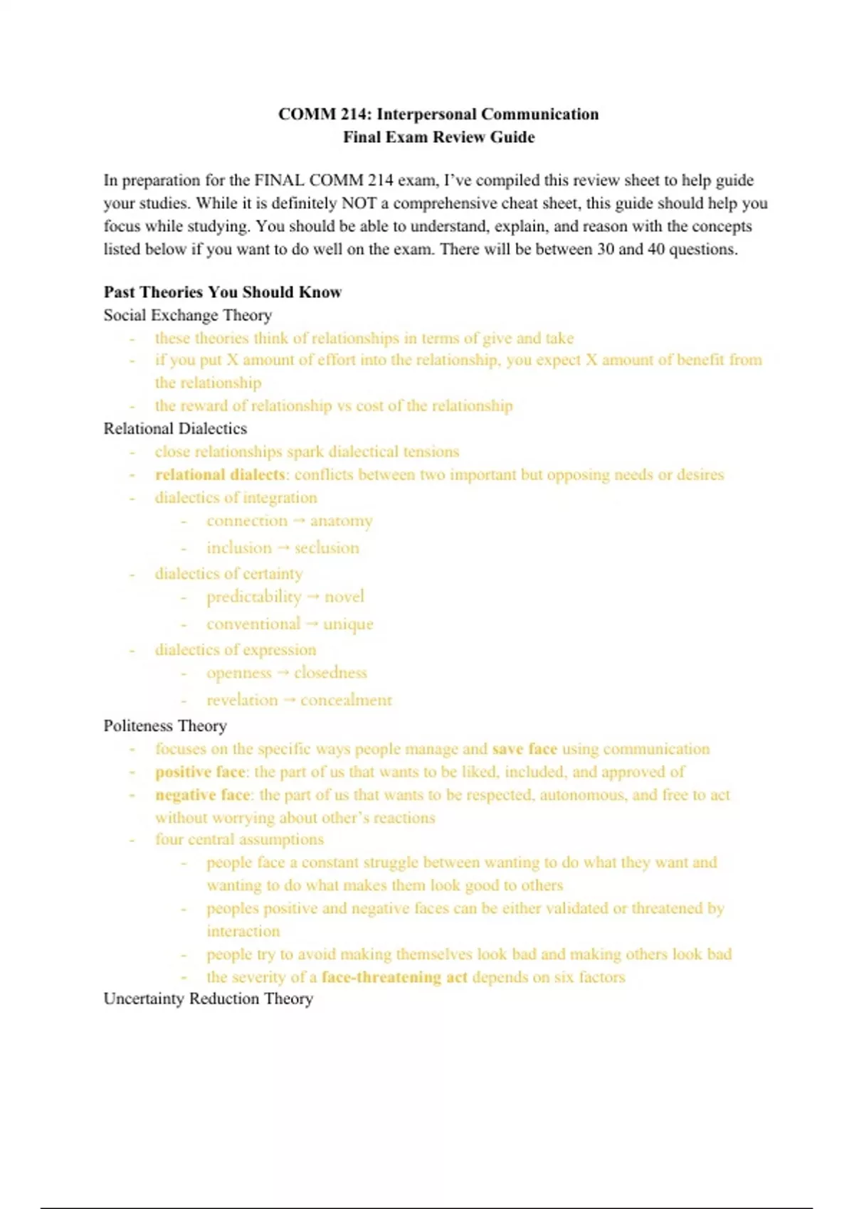 Included in the review guide that consists of both potential topics and answers are theories related to communications, love and attachment, conflict, relational transgressions, deception, relationship termination, and immediacy.