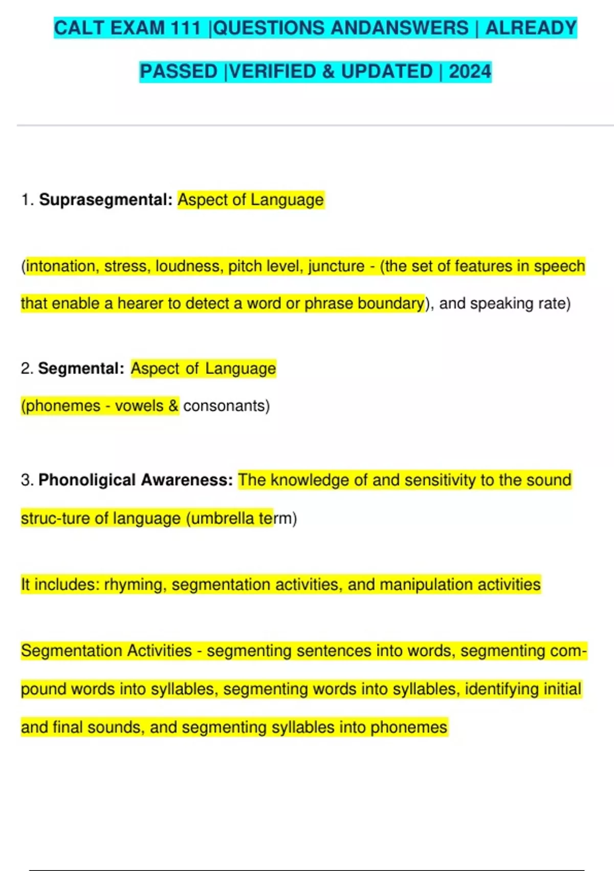 CALT EXAM 111 |QUESTIONS ANDANSWERS | ALREADY PASSED |VERIFIED & UPDATED | 2024 1. Suprasegmental: Aspect of Language (intonation, stress, loudness, pitch level, juncture - (the set of features in speech that enable a hearer to detect a word or phrase boundary), and speaking rate) 2. Segmental: Aspect of Language (phonemes - vowels & consonants) 3. Phonoligical Awareness: The knowledge of and sensitivity to the sound struc-ture of language (umbrella term) It includes: rhyming, segmentation activities, and manipulation activities Segmentation Activities - segmenting sentences into words, segmenting com- pound words into syllables, segmenting words into syllables, identifying initial and final sounds, and segmenting syllables into phonemes Manipulation Activities - omitting syllables, omitting sounds in words, and changing sounds into words 4. Dysarthria: A disorder in the nervous system which hinders control over the tongue, throat, lips, or lungs Neurological oral-motor dysfunction including weakness of the musculature nec- essary for coordinating movements of speech production (slurred speech, difficulty with articulation