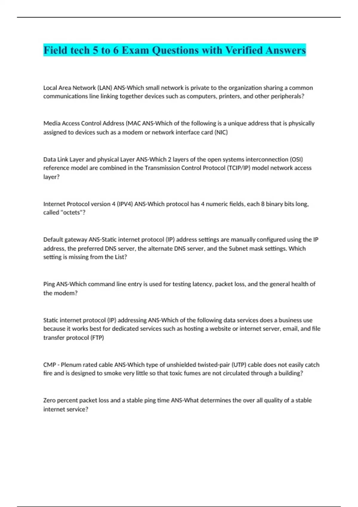 Field tech 5 to 6 Exam Questions with Verified Answers Local Area Network (LAN) ANS-Which small network is private to the organization sharing a common communications line linking together devices such as computers, printers, and other peripherals? Media Access Control Address (MAC ANS-Which of the following is a unique address that is physically assigned to devices such as a modem or network interface card (NIC) Data Link Layer and physical Layer ANS-Which 2 layers of the open systems interconnection (OSI) reference model are combined in the Transmission Control Protocol (TCIP/IP) model network access layer? Internet Protocol version 4 (IPV4) ANS-Which protocol has 4 numeric fields, each 8 binary bits long, called "octets"? Default gateway ANS-Static internet protocol (IP) address settings are manually configured using the IP address, the preferred DNS server, the alternate DNS server, and the Subnet mask settings. Which setting is missing from the List? Ping ANS-Which command line entry is used for testing latency, packet loss, and the general health of the modem? Static internet protocol (IP) addressing ANS-Which of the following data services does a business use because it works best for dedicated services such as hosting a website or internet server, email, and file transfer protocol (FTP) CMP - Plenum rated cable ANS-Which type of unshielded twisted-pair (UTP) cable does not easily catch fire and is designed to smoke very little so that toxic fumes are not circulated through a building? Zero percent packet loss and a stable ping time ANS-What determines the over all quality of a stable internet service?
