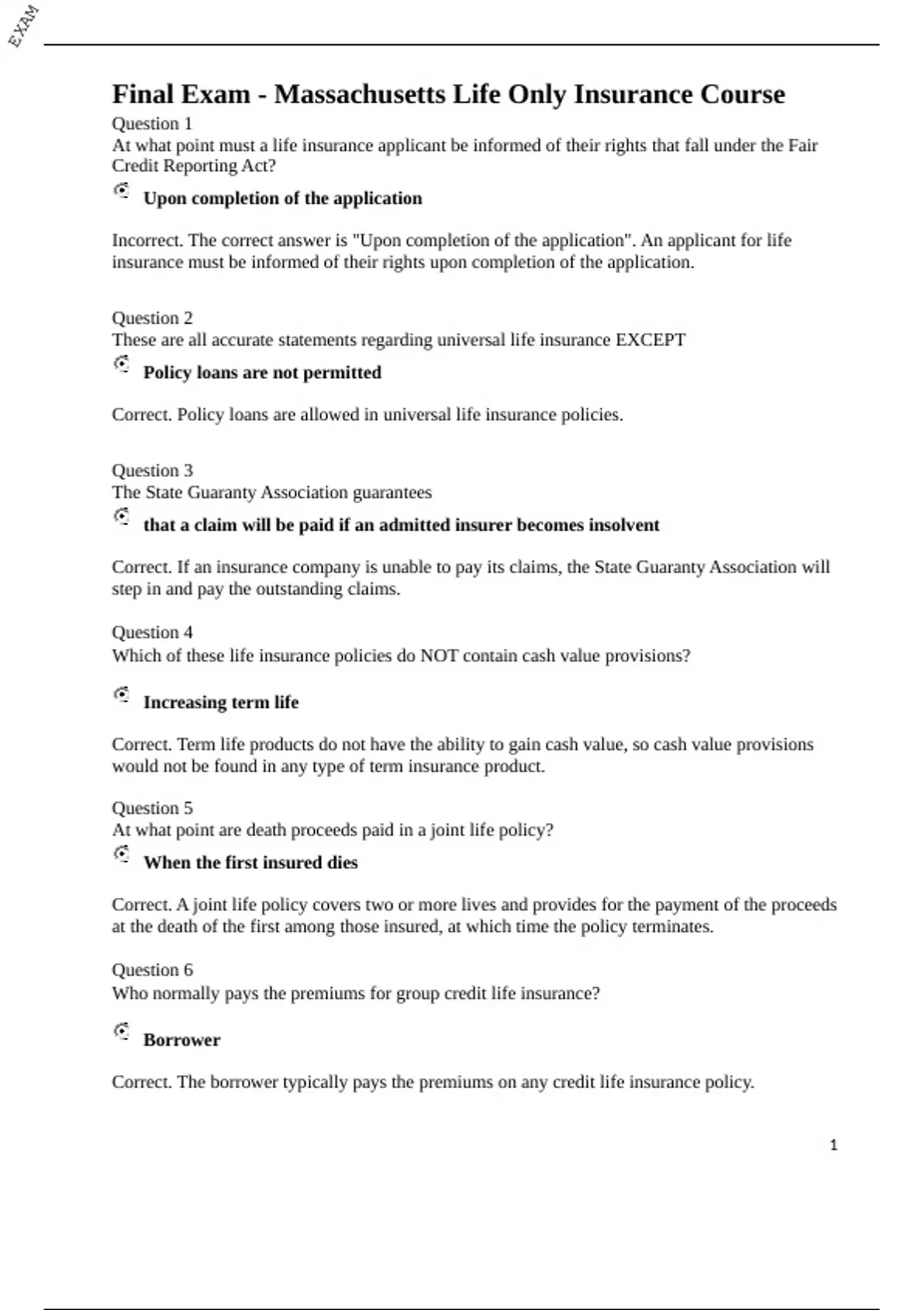 final exam massachusetts life only insurance cou