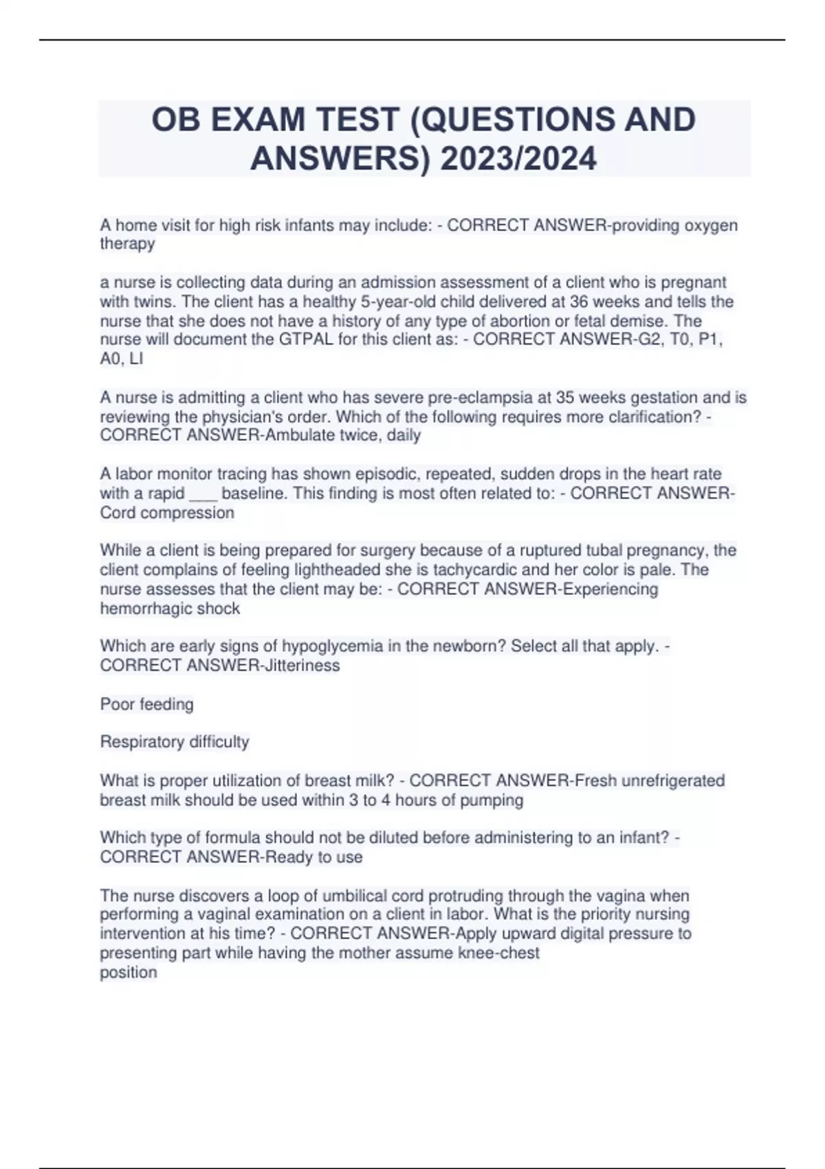 OB EXAM TEST (QUESTIONS AND ANSWERS) 2023/2024 A home visit for high risk infants may include: - CORRECT ANSWER-providing oxygen therapy a nurse is collecting data during an admission assessment of a client who is pregnant with twins. The client has a healthy 5-year-old child delivered at 36 weeks and tells the nurse that she does not have a history of any type of abortion or fetal demise. The nurse will document the GTPAL for this client as: - CORRECT ANSWER-G2, T0, P1, A0, LI A nurse is admitting a client who has severe pre-eclampsia at 35 weeks gestation and is reviewing the physician's order. Which of the following requires more clarification? - CORRECT ANSWER-Ambulate twice, daily A labor monitor tracing has shown episodic, repeated, sudden drops in the heart rate with a rapid ___ baseline. This finding is most often related to: - CORRECT ANSWERCord compression While a client is being prepared for surgery because of a ruptured tubal pregnancy, the client complains of feeling lightheaded she is tachycardic and her color is pale. The nurse assesses that the client may be: - CORRECT ANSWER-Experiencing hemorrhagic shock Which are early signs of hypoglycemia in the newborn? Select all that apply. - CORRECT ANSWER-Jitteriness Poor feeding Respiratory difficulty What is proper utilization of breast milk? - CORRECT ANSWER-Fresh unrefrigerated breast milk should be used within 3 to 4 hours of pumping Which type of formula should not be diluted before administering to an infant? - CORRECT ANSWER-Ready to use The nurse discovers a loop of umbilical cord protruding through the vagina when performing a vaginal examination on a client in labor. What is the priority nursing intervention at his time? - CORRECT ANSWER-Apply upward digital pressure to presenting part while having the mother assume knee-chest position Decreased surfactant production in the preterm lung is a problem because surfactant: - CORRECT ANSWER-Keeps the alveoli open during expiration Earliest signs of neonatal sepsis include: - CORRECT ANSWER-Temperature instability and respiratory distress Which nursing action is designed to avoid unnecessary heat loss in the newborn? - CORRECT ANSWER-Place a blanket over the scale before weighing the infant A preterm infant on a respirator has intravenous lines and much equipment around her when her parents come to visit for the first time. It is important for the nurse to: - CORRECT ANSWEREncourage the parents to touch the infant What is essential for the nurse to teach a woman who has just had an intrauterine device (IUD) inserted? - CORRECT ANSWER-If the strings are longer or shorter than before, notify her physician A patient asks how pelvic inflammatory disease (PID) can affect fertility. The nurse's best response is: - CORRECT ANSWER-It interferes with the transport of the egg (ova) due to adhesions and subsequent fallopian tube blockage Respirations are initiated at birth as a result of: - CORRECT ANSWER-Chemical, sensory, thermal, and mechanical factors The factor in a women's history that would place her at increased risk for breast cancer is: - CORRECT ANSWER-Early onset of menarche A nurse notes that a 6-hour old neonate has acrocyanosis. Which of the following actions by the nurse is appropriate? - CORRECT ANSWER-Document the findings Which of the following should be included in the discharge teaching plan for a postpartum client to assist in recognizing early signs of complications? - CORRECT ANSWER-Notify your doctor of any increase in the amount of lochia or if it returns to bright red bleeding Newborns classified as small for gestational age (SGA): - CORRECT ANSWER-Are below the tenth percentile in size on growth charts A pregnant client asks the nurse about the purpose of the placenta. The nurse responds most appropriately by telling the client that the placenta: - CORRECT ANSWERProvides an exchange of nutrients and waste products between the mother and the fetus A 29-week pregnant client states, "my rings have been really tight in the morning." Which of the following nursing assessments would be the most suggestive that this patient may be developing preeclampsia? - CORRECT ANSWER-+2 protein in urine and an increase in her diastolic blood pressure In which condition is breastfeeding contraindicated? - CORRECT ANSWER-Mothers with HIV Transitory tachypnea of the newborn (TTN) is thought to occur as a result of: - CORRECT ANSWER-Delayed absorption of fetal lung fluid The clinic nurse understands that further medical evaluation will need to be scheduled when a woman reports: - CORRECT ANSWER-Post-menopausal bleeding What postpartum hemorrhage conditions are considered medical emergencies that require immediate treatment? - CORRECT ANSWER-Uterine atony and disseminated intravascular coagulation The priority assessment for a positive Coombs' test in the newborn is: - CORRECT ANSWER-Bilirubin level The symptoms of mild to moderate urinary incontinence can be successfully decreased by a number of strategies. Which of these should the nurse instruct the client to use first? - CORRECT ANSWER-Bladder training and pelvic muscle exercises Four term babies have just been admitted into the neonatal nursery. Which of the babies should the nurse assess first? - CORRECT ANSWER-Baby with apgar 9/9, weight 4660 grams (10 pounds, 4 oz) Careful follow-up of the woman who has had gestational trophoblastic disease, hydatidiform mole, is important because she: - CORRECT ANSWER-May develop choriocarcinoma The husband tells the nurse that sometimes his wife, who is 12 weeks gestation, seems excited about the pregnancy, and at other times, she expresses doubts about having the baby. Upon which of these statements should the nurse's reply be based? - CORRECT ANSWER-Mood swings and mixed feelings about pregnancy are common in the mother A term neonate has an elevated bilirubin and is slightly jaundiced on day three of life. What is the probable reason for these changes? - CORRECT ANSWER-Physiological d