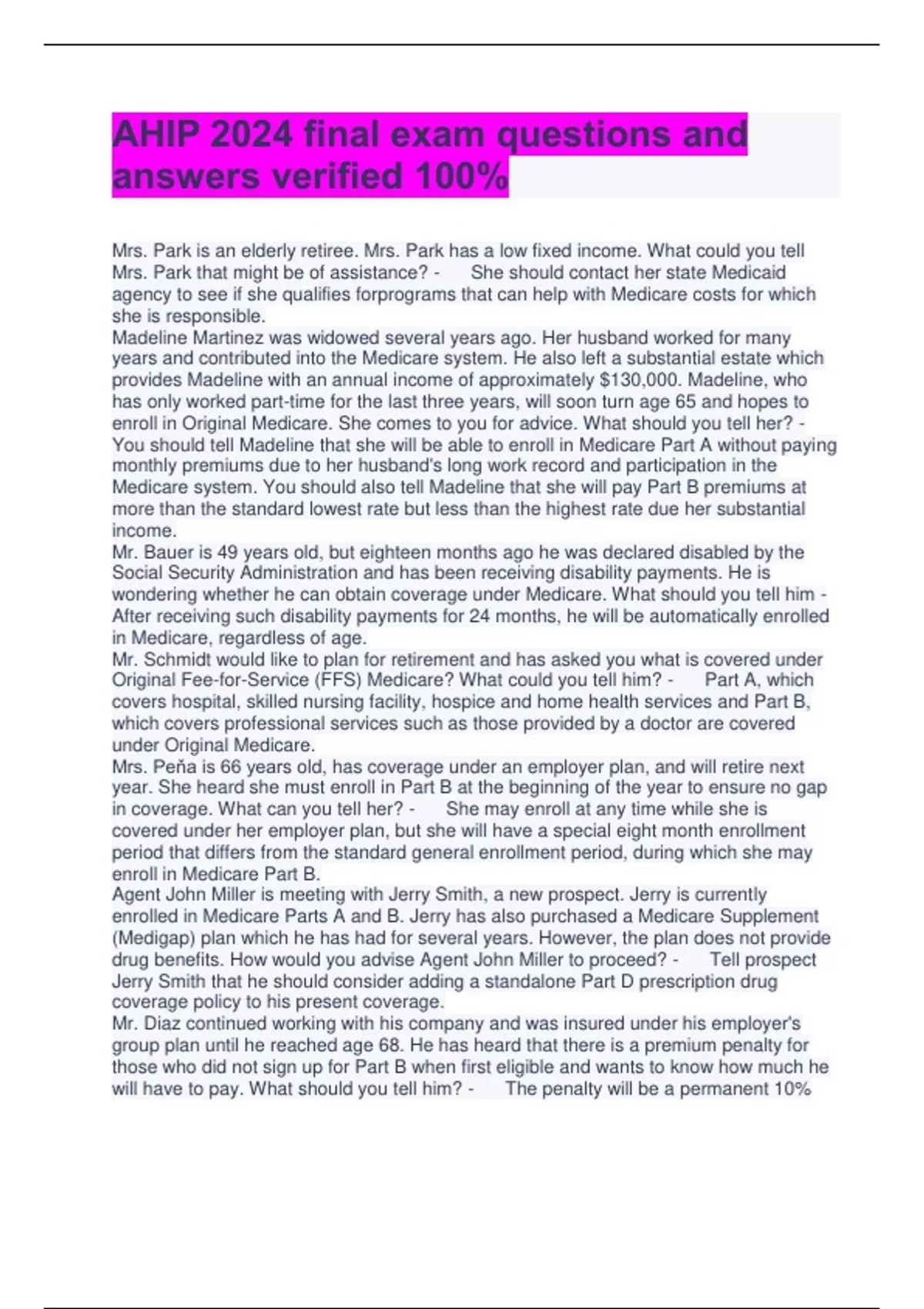AHIP 2024 final exam questions and answers verified 100% Mrs. Park is an elderly retiree. Mrs. Park has a low fixed income. What could you tell Mrs. Park that might be of assistance? - She should contact her state Medicaid agency to see if she qualifies forprograms that can help with Medicare costs for which she is responsible. Madeline Martinez was widowed several years ago. Her husband worked for many years and contributed into the Medicare system. He also left a substantial estate which provides Madeline with an annual income of approximately $130,000. Madeline, who has only worked part-time for the last three years, will soon turn age 65 and hopes to enroll in Original Medicare. She comes to you for advice. What should you tell her? - You should tell Madeline that she will be able to enroll in Medicare Part A without paying monthly premiums due to her husband's long work record and participation in the Medicare system. You should also tell Madeline that she will pay Part B premiums at more than the standard lowest rate but less than the highest rate due her substantial income. Mr. Bauer is 49 years old, but eighteen months ago he was declared disabled by the Social Security Administration and has been receiving disability payments. He is wondering whether he can obtain coverage under Medicare. What should you tell him - After receiving such disability payments for 24 months, he will be automatically enrolled in Medicare, regardless of age. Mr. Schmidt would like to plan for retirement and has asked you what is covered under Original Fee-for-Service (FFS) Medicare? What could you tell him? - Part A, which covers hospital, skilled nursing facility, hospice and home health services and Part B, which covers professional services such as those provided by a doctor are covered under Original Medicare. Mrs. Peňa is 66 years old, has coverage under an employer plan, and will retire next year. She heard she must enroll in Part B at the beginning of the year to ensure no gap in coverage. What can you tell her? - She may enroll at any time while she is covered under her employer plan, but she will have a special eight month enrollment period that differs from the standard general enrollment period, during which she may enroll in Medicare Part B. Agent John Miller is meeting with Jerry Smith, a new prospect. Jerry is currently enrolled in Medicare Parts A and B. Jerry has also purchased a Medicare Supplement (Medigap) plan which he has had for several years. However, the plan does not provide drug benefits. How would you advise Agent John Miller to proceed? - Tell prospect Jerry Smith that he should consider adding a standalone Part D prescription drug coverage policy to his present coverage. Mr. Diaz continued working with his company and was insured under his employer's group plan until he reached age 68. He has heard that there is a premium penalty for those who did not sign up for Part B when first eligible and wants to know how much he will have to pay. What should you tell him? - The penalty will be a permanent 10% increase in his Part B premium for every 12-month period that passed during which he could have enrolled and did not. Ms. Moore plans to retire when she turns 65 in a few months. She is in excellent health and will have considerable income when she retires. She is concerned that her income will make it impossible for her to qualify for Medicare. What could you tell her to address her concern? - Medicare is a program for people age 65 or older and those under age 65 with certain disabilities, end-stage renal disease, and Lou Gehrig's disease so she will be eligible for Medicare. Mildred Savage enrolled in Allcare Medicare Advantage plan several years ago. Mildred recently learned that she is suffering from inoperable cancer and has just a few months to live. She would like to spend these final months in hospice care. Mildred's family asks you whether hospice benefits will be paid for under the Allcare Medicare Advantage plan. What should you say? - Mildred may remain enrolled in Allcare and make a hospice election. Hospice benefits will be paid for by Original Medicare under Part A and Allcare will continue to pay for any non-hospice services. Mr. Gomez notes that a Private Fee-for-Service (PFFS) plan available in his area has an attractive premium. He wants to know if he must use doctors in a network as his current HMO plan requires him to do. What should you tell him? - He may receive health care services from any doctor allowed to bill Medicare, as long as he shows the doctor the plan's identification card and the doctor agrees to accept the PFFS plan's payment terms and conditions, which could include balance billing. Mr. Kelly wants to know whether he is eligibl