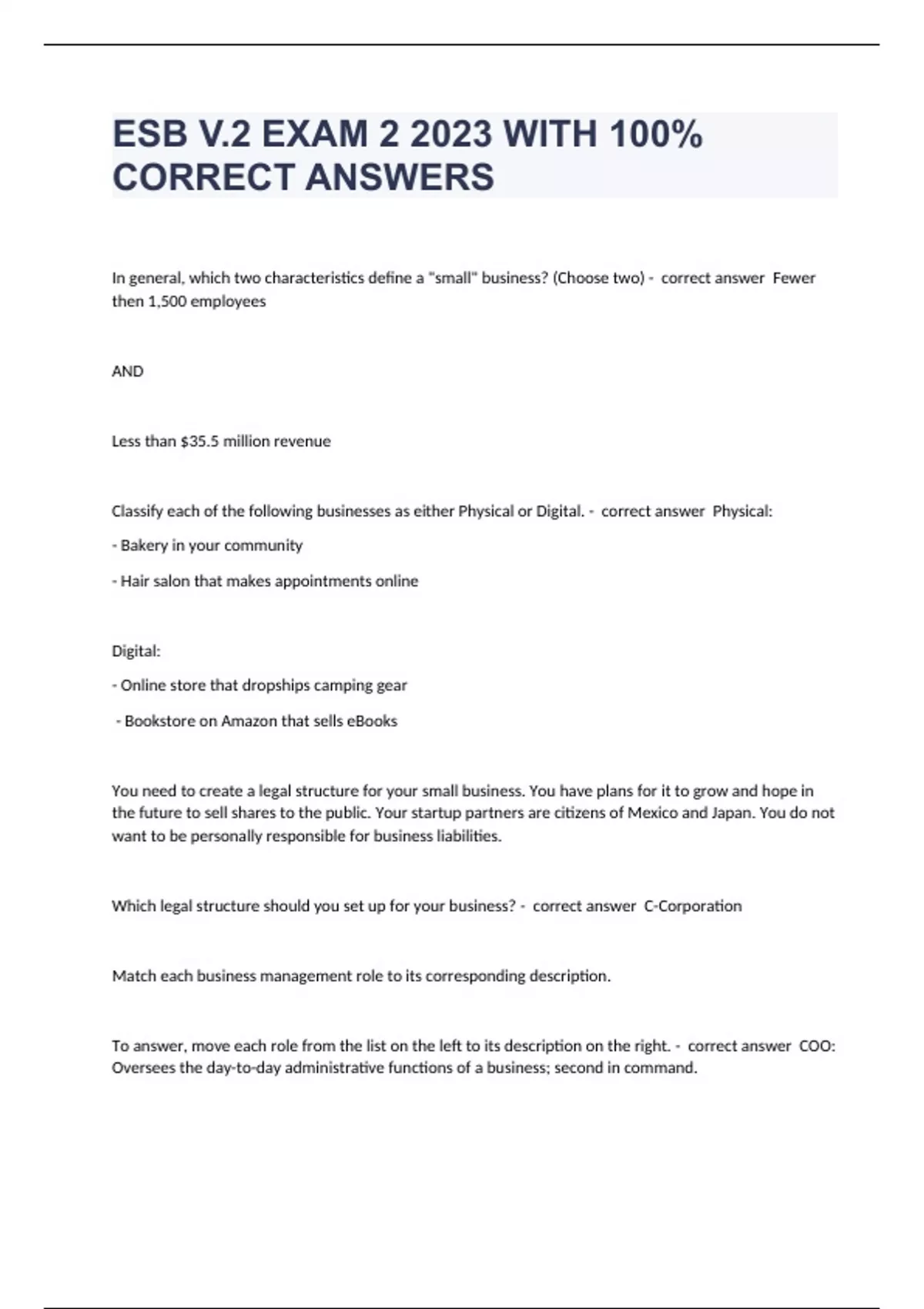 In general, which two characteristics define a "small" business? (Choose two) - correct answer Fewer then 1,500 employees AND Less than $35.5 million revenue Classify each of the following businesses as either Physical or Digital. - correct answer Physical: - Bakery in your community - Hair salon that makes appointments online Digital: - Online store that dropships camping gear - Bookstore on Amazon that sells eBooks You need to create a legal structure for your small business. You have plans for it to grow and hope in the future to sell shares to the public. Your startup partners are citizens of Mexico and Japan. You do not want to be personally responsible for business liabilities. Which legal structure should you set up for your business? - correct answer C-Corporation Match each business management role to its corresponding description. To answer, move each role from the list on the left to its description on the right. - correct answer COO: Oversees the day-to-day administrative functions of a business; second in command. CIO: De