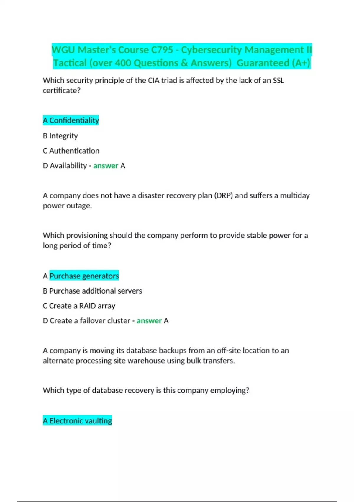 WGU Master's Course C795 - Cybersecurity Management II Tactical (over 400 Questions & Answers) Guaranteed (A+).docx WGU Master's Course C795 - Cybersecurity Management II Tactical (over 400 Questions & Answers) Guaranteed (A+).docx