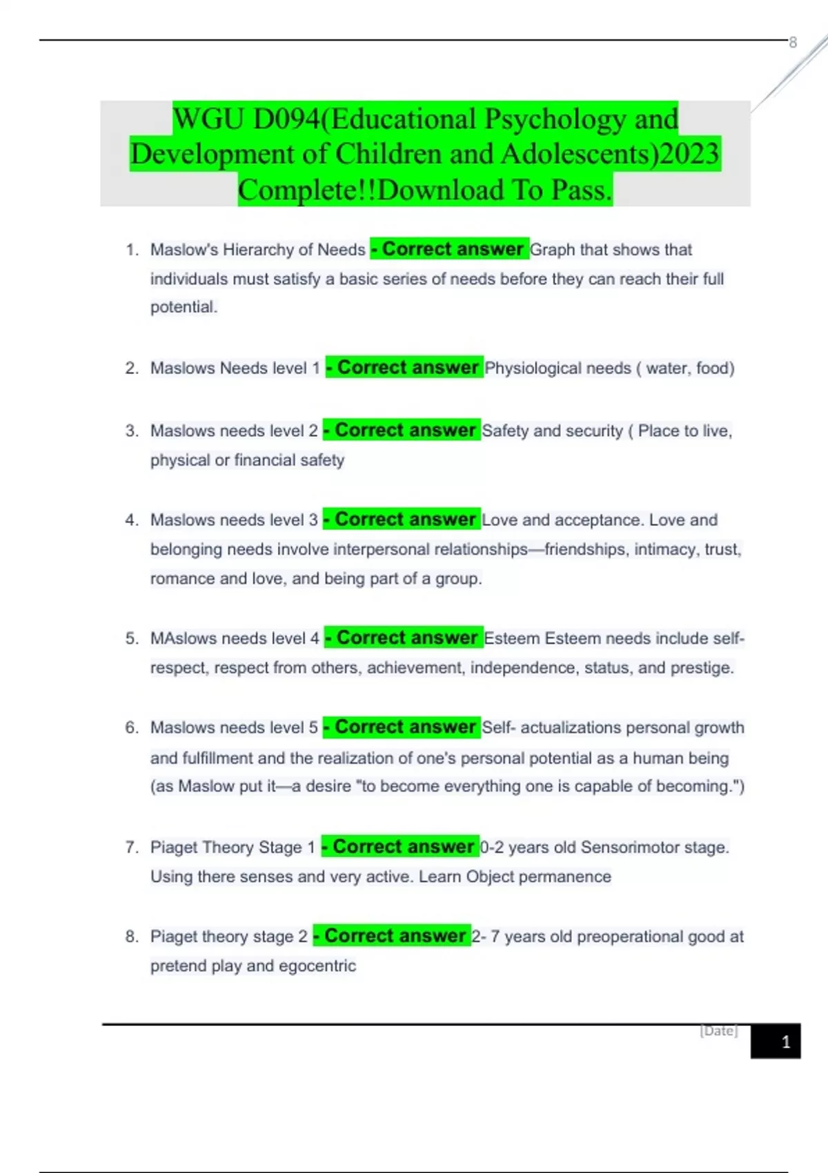 WGU D094(Educational Psychology and Development of Children and Adolescents)2023 Complete!!Download To Pass.