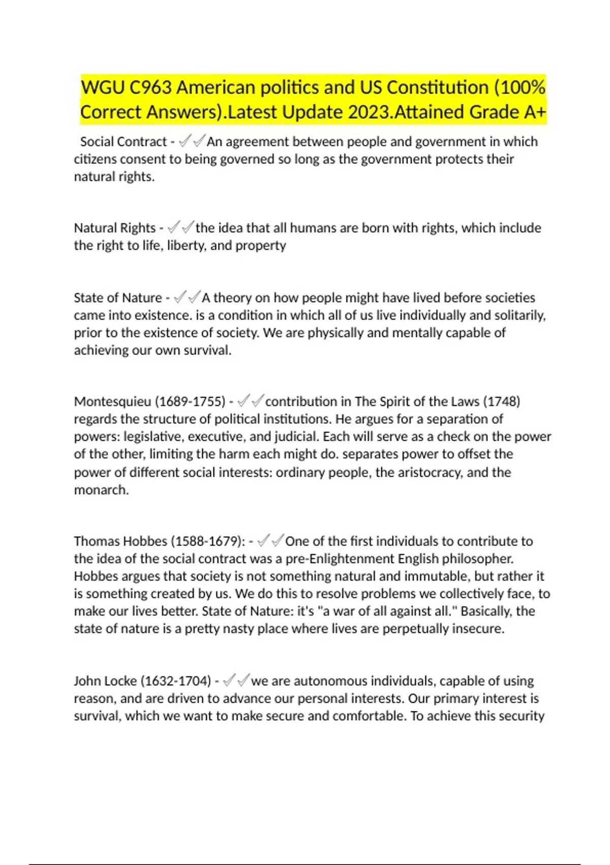 WGU C963 American politics and US Constitution (100% Correct Answers).Latest Update 2023.Attained Grade A+.docx