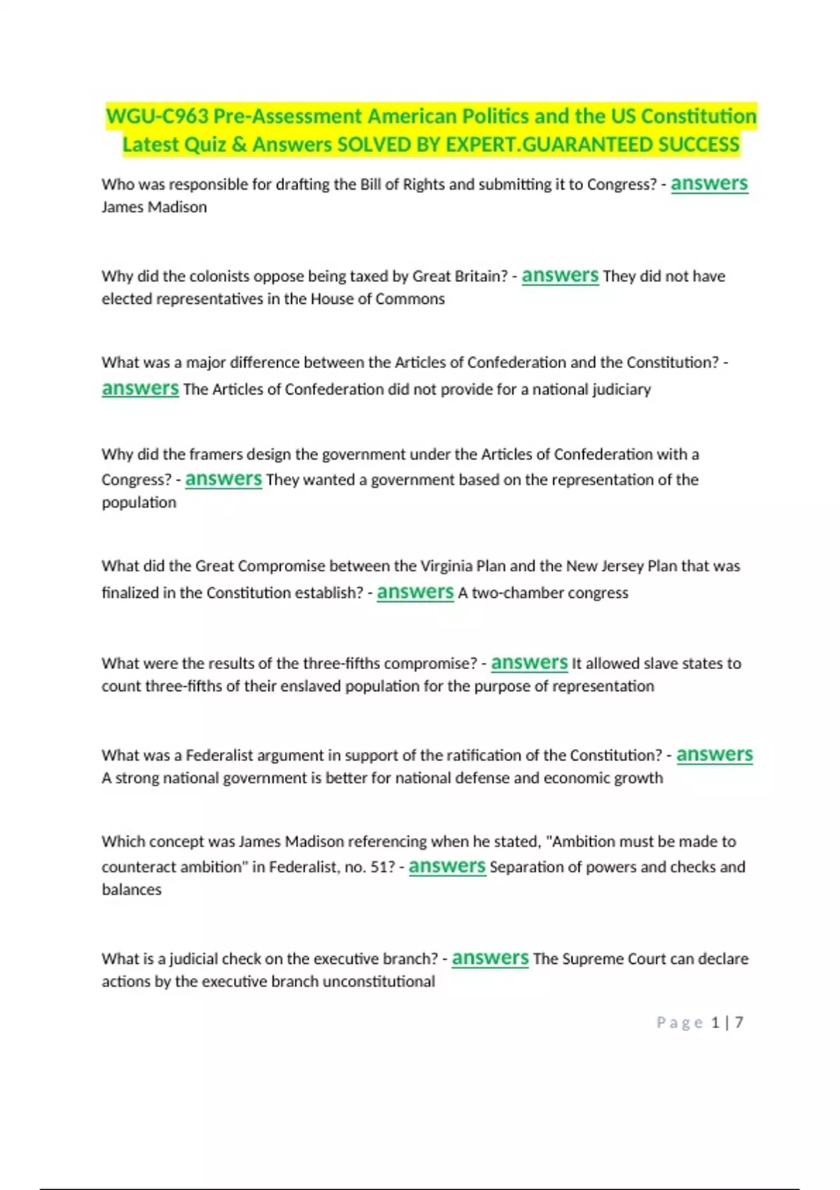 WGU-C963 Pre-Assessment American Politics and the US Constitution Latest Quiz & Answers SOLVED BY EXPERT.GUARANTEED SUCCESS.
