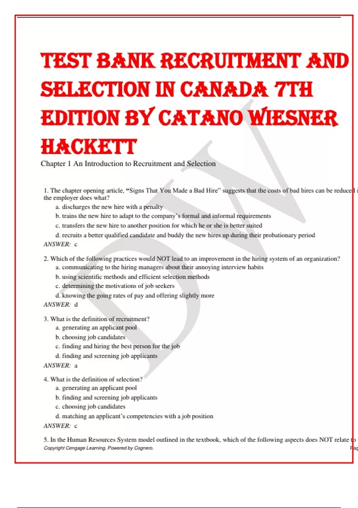 TEST BANK RECRUITMENT AND SELECTION IN CANADA 7TH EDITION BY CATANO WIESNER HACKETT