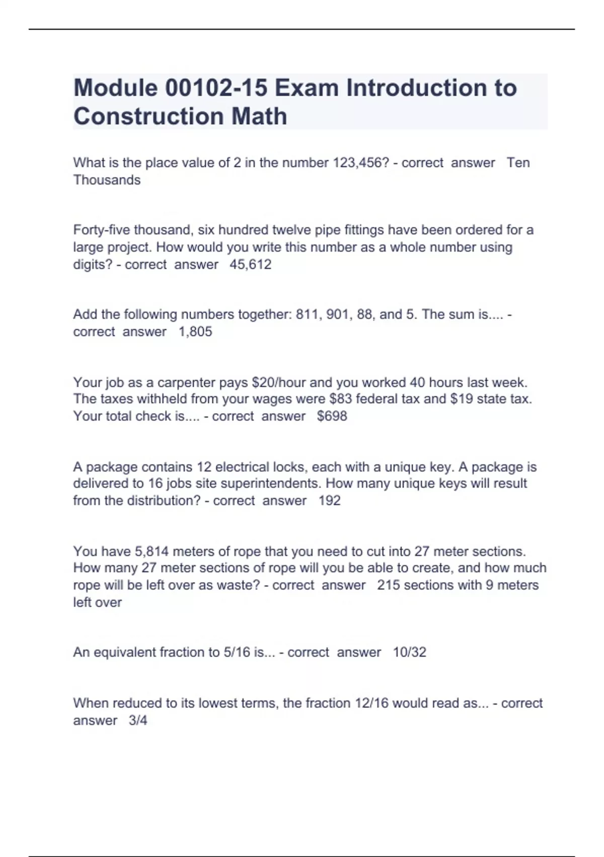 Module 00102 Question and answers 100% correct 2023/2024What is the place value of 2 in the number 123,456? - correct answer Ten Thousands Forty-five thousand, six hundred twelve pipe fittings have been ordered for a large project. How would you write this number as a whole number using digits? - correct answer 45,612 Add the following numbers together: 811, 901, 88, and 5. The sum is.... - correct answer 1,805 Your job as a carpenter pays $20/hour and you worked 40 hours last week. The taxes withheld from your wages were $83 federal tax and $19 state tax. Your total check is.... - correct answer $698 A package contains 12 electrical locks, each with a unique key. A package is delivered to 16 jobs site superintendents. How many unique keys will result from the distribution? - correct answer 192 You have 5,814 met