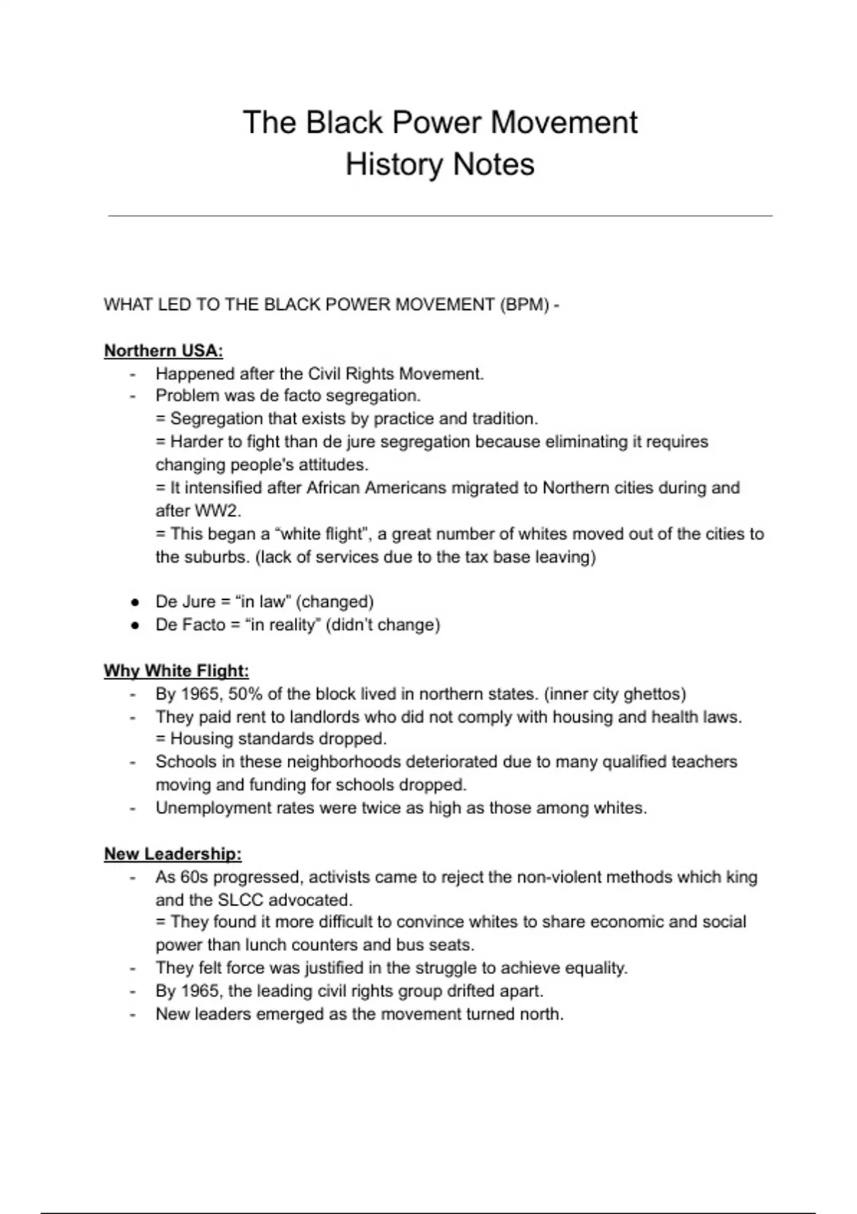Summary History - The Black Power Movement Notes