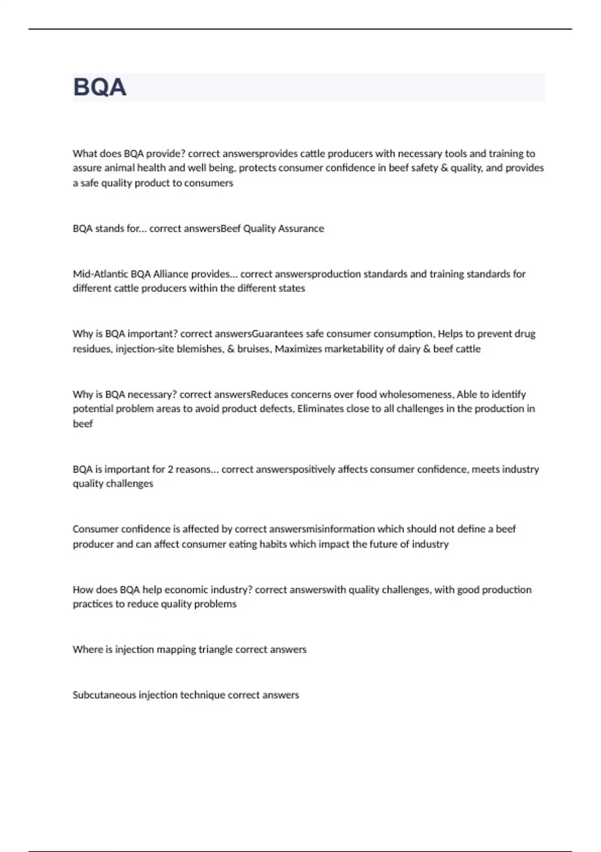 What does BQA provide? correct answersprovides cattle producers with necessary tools and training to assure animal health and well being, protects consumer confidence in beef safety & quality, and provides a safe quality product to consumers BQA stands for... correct answersBeef Quality Assurance Mid-Atlantic BQA Alliance provides... correct answersproduction standards and training standards for different cattle producers within the different states Why is BQA important? correct answersGuarantees safe consumer consumption, Helps to prevent drug residues, injection-site blemishes, & bruises, Maximizes marketability of dairy & beef cattle Why is BQA necessary? correct answersReduces concerns over food wholesomeness, Able to identify potential problem areas to avoid product defects, Eliminates close to all challenges in the production in beef BQA is important for 2 reasons... correct answerspositively affects consumer confidence, meets industry quality challenges Consumer confidence is affected by correct answersmisinformation which should not define a beef producer and can affect consumer eating habits which impact the future of industry How does BQA help economic industry? correct answerswith quality challenges, with good production practices to reduce quality problems Where is injection mapping triangle correct answers Subcutaneous injection technique correct answers