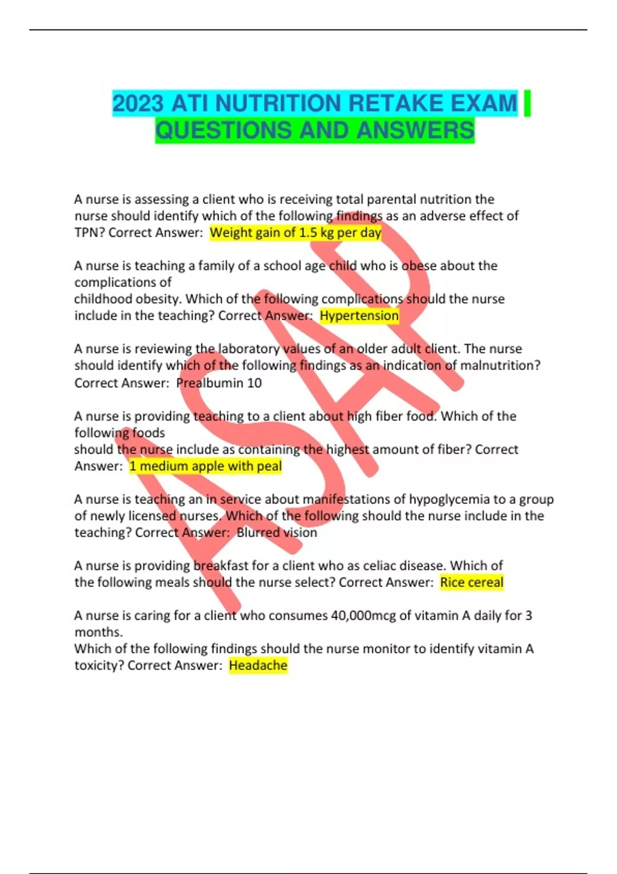 2023 ATI NUTRITION RETAKE EXAM QUESTIONS AND ANSWERS A nurse is assessing a client who is receiving total parental nutrition the nurse should identify which of the following findings as an adverse effect of TPN? Correct Answer: Weight gain of 1.5 kg per day A nurse is teaching a family of a school age child who is obese about the complications of childhood obesity. Which of the following complications should the nurse include in the teaching? Correct Answer: Hypertension A nurse is reviewing the laboratory values of an older adult client. The nurse should identify which of the following findings as an indication of malnutrition? Correct Answer: Prealbumin 10 A nurse is providing teaching to a client about high fiber food. Which of the following foods should the nurse include as containing the highest amount of fiber? Correct Answer: 1 medium apple with peal A nurse is teaching an in service about manifestations of hypoglycemia to a group of newly licensed nurses. Which of the following should the nurse include in the teaching? Correct Answer: Blurred vision A nurse is providing breakfast for a client who as celiac disease. Which of the following meals should the nurse select? Correct Answer: Rice cereal A nurse is caring for a client who consumes 40,000mcg of vitamin A daily for 3 months. Which of the following findings should the nurse monitor to identify vitamin A toxicity? Correct Answer: Headach