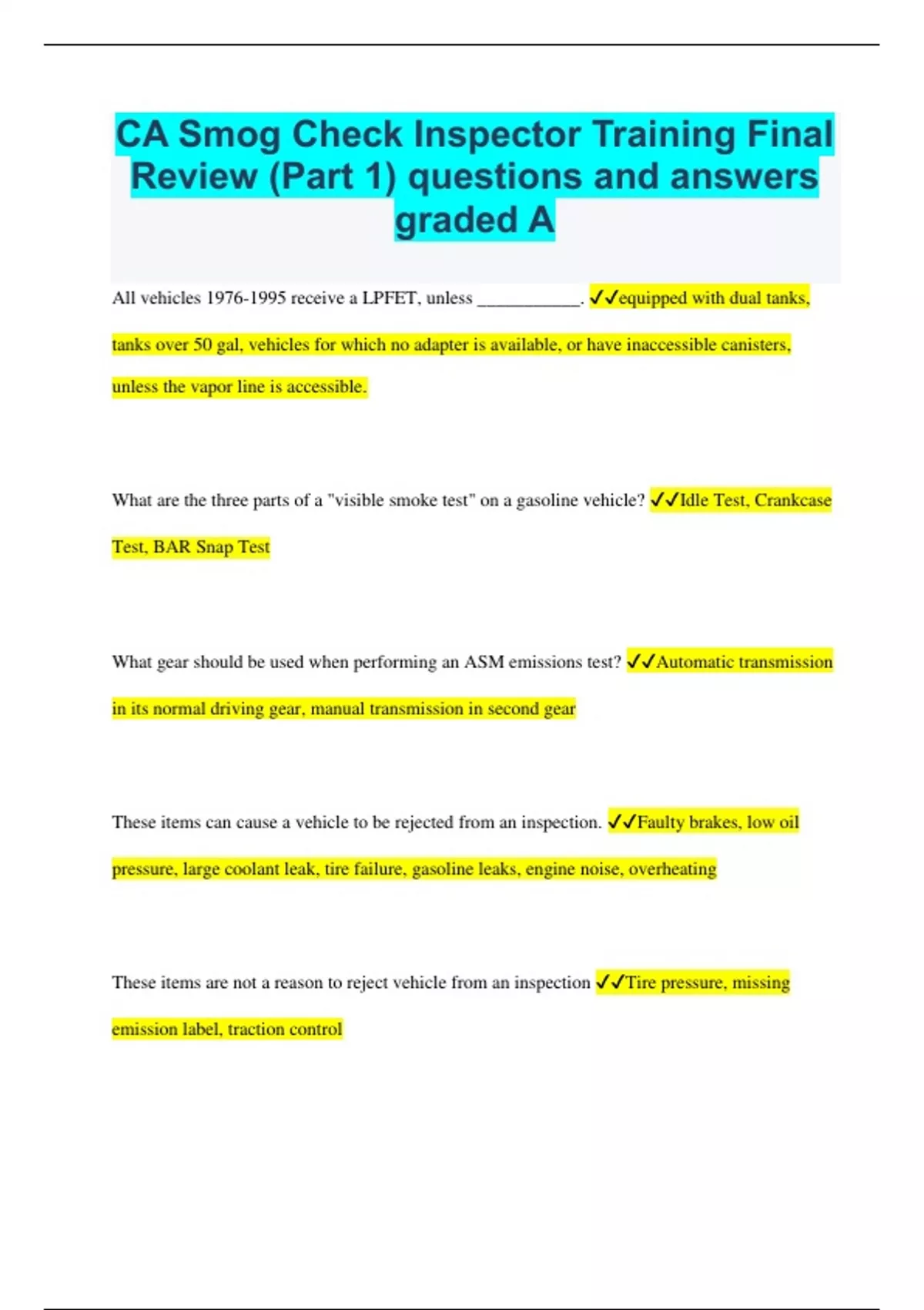 CA Smog Check Inspector Training Final Review (Part 1) questions and answers graded A