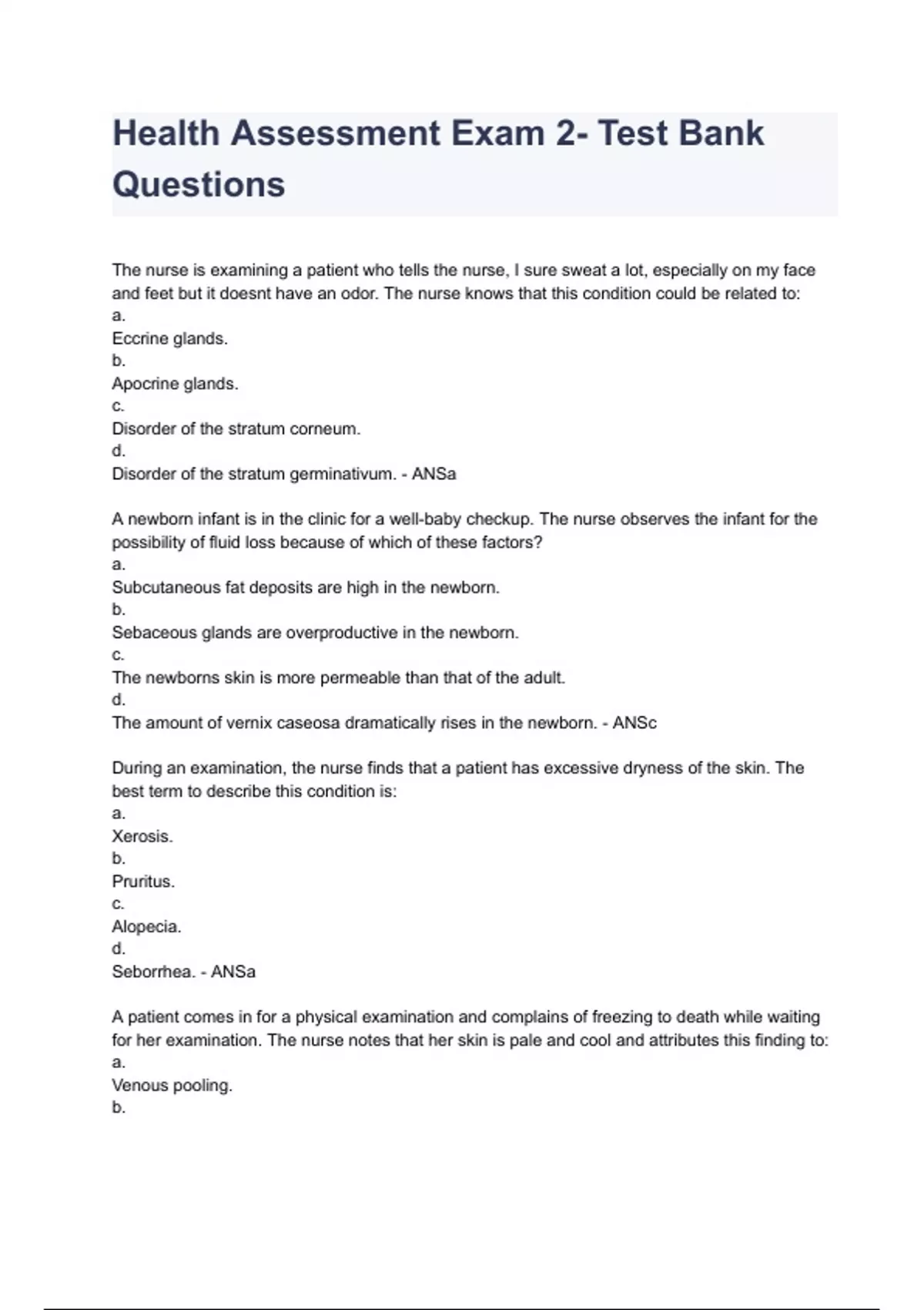 During an examination, the nurse finds that a patient has excessive dryness of the skin. The
