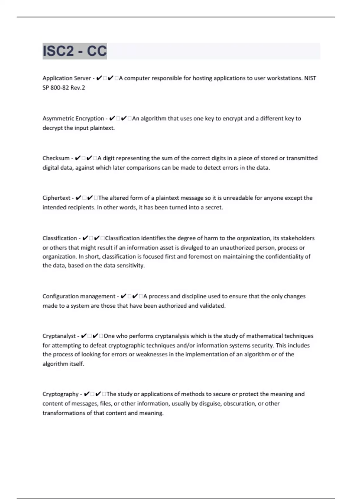 Application Server - ️️A computer responsible for hosting applications to user workstations. NIST SP 800-82 Rev.2 Asymmetric Encryption - ️️An algorithm that uses one key to encrypt and a different key to decrypt the input plaintext. Checksum - ️️A digit representing the sum of the correct digits in a piece of stored or transmitted digital data, against which later comparisons can be made to detect errors in the data. Ciphertext - ️️The altered form of a plaintext message so it is unreadable for anyone except the intended recipients. In other words, it has been turned into a secret. Classification - ️️Classification identifies the degree of harm to the organization, its stakeholders or others that might result if an information asset is divulged to an unauthorized person, process or organization. In short, classification is focused first and foremost on maintaining the confidentiality of the data, based on the data sensitivity. Configuration management - ️️A process and discipline used to ensure that the only changes made to a system are those that have been authorized and validated. Cryptanalyst - ️️One who performs cryptanalysis which is the study of mathematical techniques for attempting to defeat cryptographic techniques and/or information systems security. This includes the process of looking for errors or weaknesses in the implementation of an algorithm or of the algorithm itself. Cryptography - ️️The study or applications of methods to secure or protect the meaning and content of messages, files, or other information, usually by disguise, obscuration, or other transformations of that content and meaning.