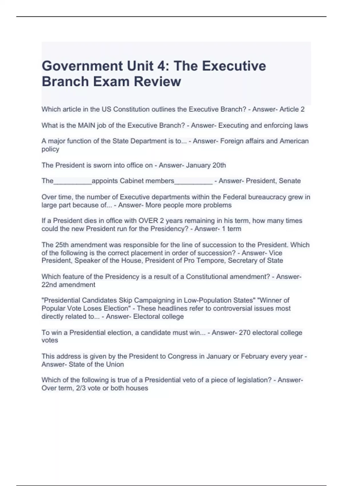 Government Unit 4 The Executive Branch Exam Review Questions and Answers
