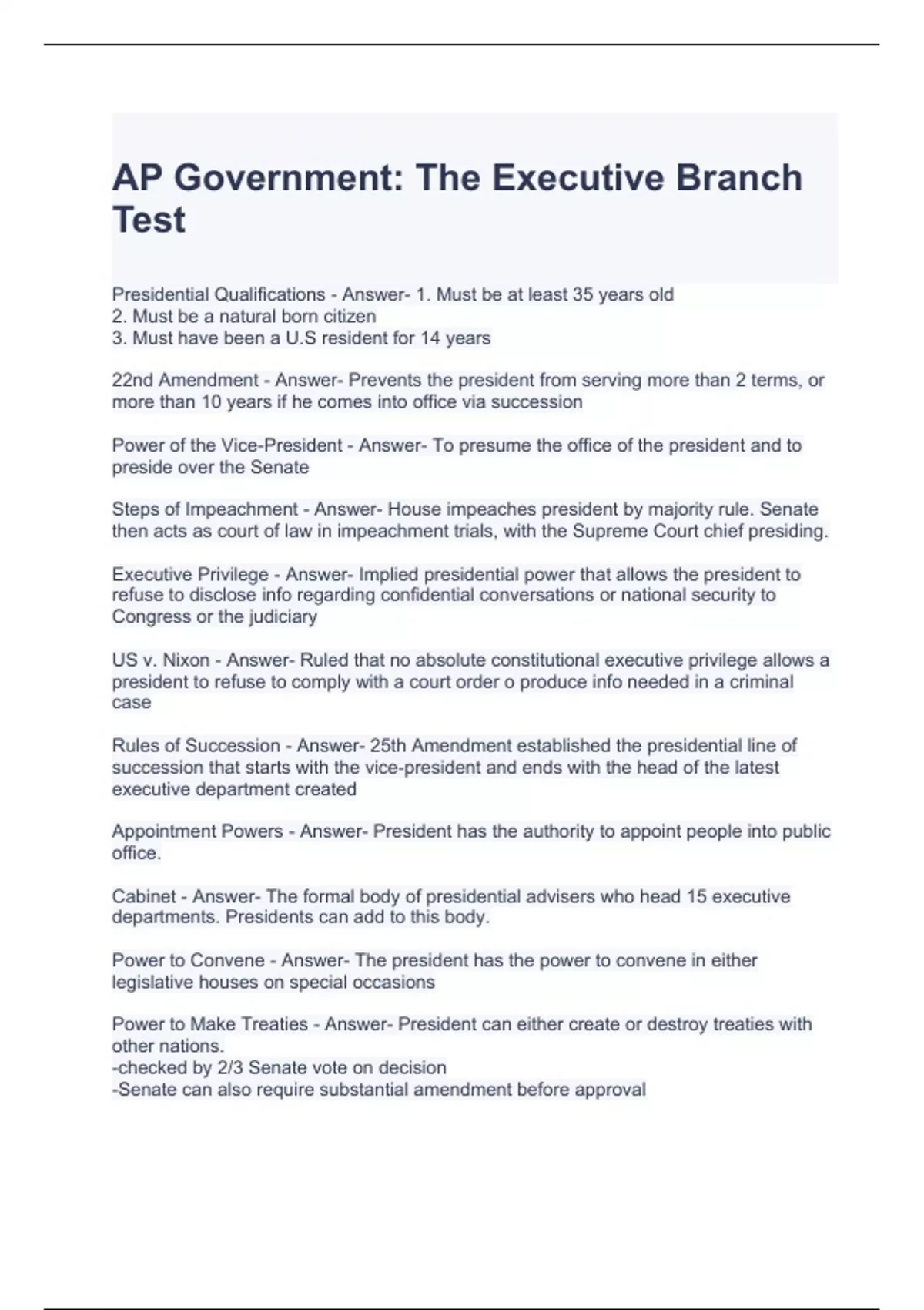 AP Government The Executive Branch Test Questions and Answers
