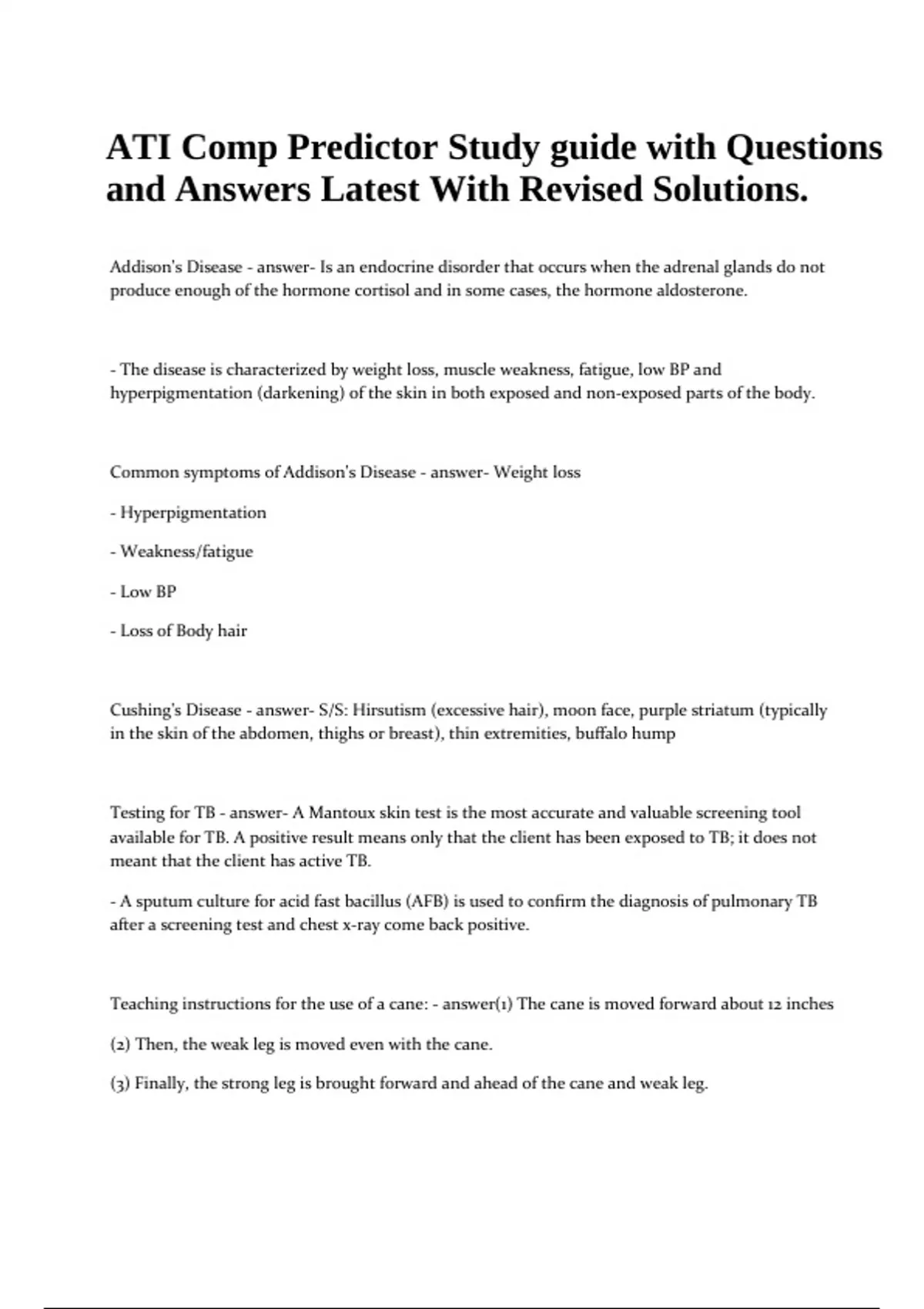 ATI Comp Predictor Study guide with Questions and Answers Latest With Revised Solutions. Addison's Disease - answer- Is an endocrine disorder that occurs when the adrenal glands do not produce enough of the hormone cortisol and in some cases, the hormone aldosterone. - The disease is characterized by weight loss, muscle weakness, fatigue, low BP and hyperpigmentation (darkening) of the skin in both exposed and non-exposed parts of the body. Common symptoms of Addison's Disease - answer- Weight loss - Hyperpigmentation - Weakness/fatigue - Low BP - Loss of Body hair Cushing's Disease - answer- S/S: Hirsutism (excessive hair), moon face, purple striatum (typically in the skin of the abdomen, thighs or breast), thin extremities, buffalo hump Testing for TB - answer- A Mantoux skin test is the most accurate and valuable screening tool available for TB. A positive result means only that the client has been exposed to TB; it does not meant that the client has active TB. - A sputum culture for acid fast bacillus (AFB) is used to confirm the diagnosis of pulmonary TB after a screening test and chest x-ray come back positive. Teaching instructions for the use of a cane: - answer(1) The cane is moved forward about 12 inches (2) Then, the weak leg is moved even with the cane. (3) Finally, the strong leg is brought forward and ahead of the cane and weak leg. ATI Comp Predictor Study guide with Questions and Answers Latest With Revised Solutions. - Canes are held on the strong side - The grip of the cane should be level with the trochanter of the femur Veracity - answer- Is truthfulness. This is the value that requires the nurse to tell the truth to every client and to make sure that the client fully understands the message. Autonomy - answer- Is the right to independence and personal freedom, which leads to the primacy of self-determination Fidelity - answer- Is the duty to keep promises. It refers to the obligation to be faithful to agreements, commitments and responsibilities that are made. Nonmaleficence - answer- Is the obligation and duty to do no harm. Meningococcal vaccine - answer- Recommended that this vaccine be given to children who are 11 through 12 years of age and then given a booster dose at age 16. When should the single dose of Herpes zoster vaccine be given? - answer- To adults 60 years or older whether or not they report a previous episode of herpes zoster. Rotavirus should be given at what age? - answer- During the child's first year of life. Alendronate (Fosamax) - answer- This medication is used to prevent and treat postmenopausal osteoporosis and Paget's Disease. - Alendronate must be taken first thing in the morning on an empty stomach. - The pt must be instructed to wait at least 30 minutes after taking Alendronate before eating, drinking, or taking other medications. What to expect with a pt having a chest tube? - answer- Continuous gentle bubbling in the suction control chamber - Crepitus (with a pneumothorax, this will persist for several hours depending) - Oscillations or also called tidaling in the water seal chamber upon respiration are also expected. Symptoms of hypocalcemia - answer- Numbness and tingling in the hands, soles of the feet and around the lips. - A nurse would assess the client for a positive reaction by eliciting the Chvostek's sign. What is a potential complication of a thyroidectomy? - answer- Hypocalcemia, which can include numbness and tingling in the hands, soles of the feet and around the lips. What assessment tool would a nurse use to determine hypocalcemia? - answer- Chvostek's sign What is Chvostek's sign? And how is it done? - answerTap on the pt's face at a point just anterior to the ear and just below the zygomatic bone. A positive response would be twitching of the ipsilateral (same side only) facial muscles, suggestive of neuromuscular excitability caused by hypocalcemia. Brudzinski's sign - answer- Is an indication of meningeal irritation, which may be positive with pt's with meningitis. - To perform this, the client needs to be supine. The nurse places one hand behind the pt's head and places the other hand on the clients chest. The nurse then raises the clients head (with the hand behind the head) while the hand on the chest restrains the clients and prevents the client from rising. Flexion of the clients lower extremities constitutes a positive sign. Kernig's sign - answer- Is an indication of meningeal irritation. The maneuver is usually performed with the client supine with hips and knees in flexion. Extension of the knees is attempted and the inability to extend the clients knee beyond 135 degrees w/out causing pain constitutes a positive test. Babinski sign - answer- This is used to test for brain damage or upper motor neuron damage. It is considered positive if the toes flare up upon stroking the plantar aspect of the foot. Cataract surgery discharge instructions - answer- Do not lift anything heavier than 10lbs for at least one week - Sleep on your back or unaffected side to lessen the pressure. - Need to report any pain, decrease in vision or increase in discharge in the eye. - It is normal to feel itching and mild discomfort after surgery, but the pt should be instructed not to rub or place pressure on the eye. Exposure or possible exposure to anthrax - answer- Administer an antibiotic prophylaxis to all pt's newly exposed **Those exposed to anthrax do not require decontamination and are not considered contagious** Botulism treatment - answer- Give an antitoxin Why would lidocaine (Xylocaine) be given to someone following cardiac arrest? - answerLidocaine is an antiarrhythmic med that is commonly used to restore a regular heartbeat in a client who has arrhythmia. This effect is produced by delaying abnormal nerve pulses to the heart and reducing irritability of the heart tissue.