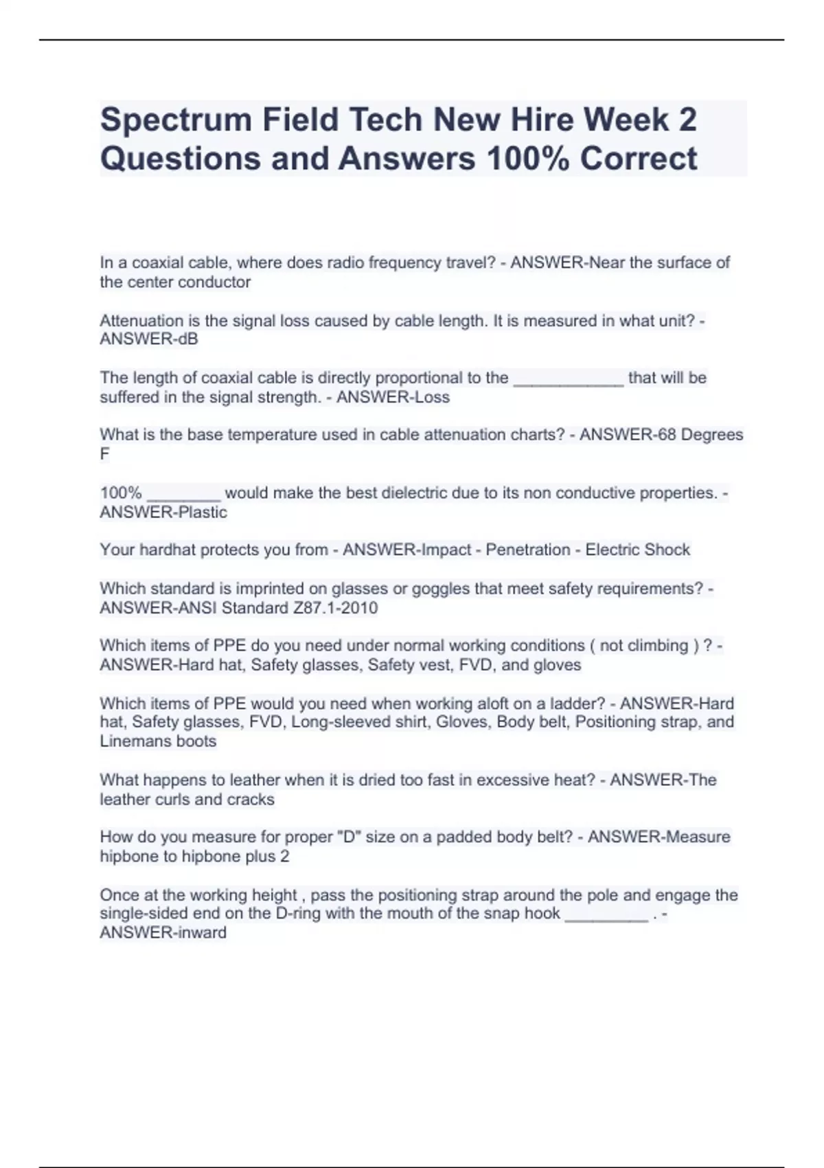 Spectrum Field Tech New Hire Week 2 Questions and Answers 100% Correct Spectrum Field Tech New Hire Week 2 Questions and Answers 100% Correct In a coaxial cable, where does radio frequency travel? - ANSWER-Near the surface of the center conductor Attenuation is the signal loss caused by cable length. It is measured in what unit? - ANSWER-dB