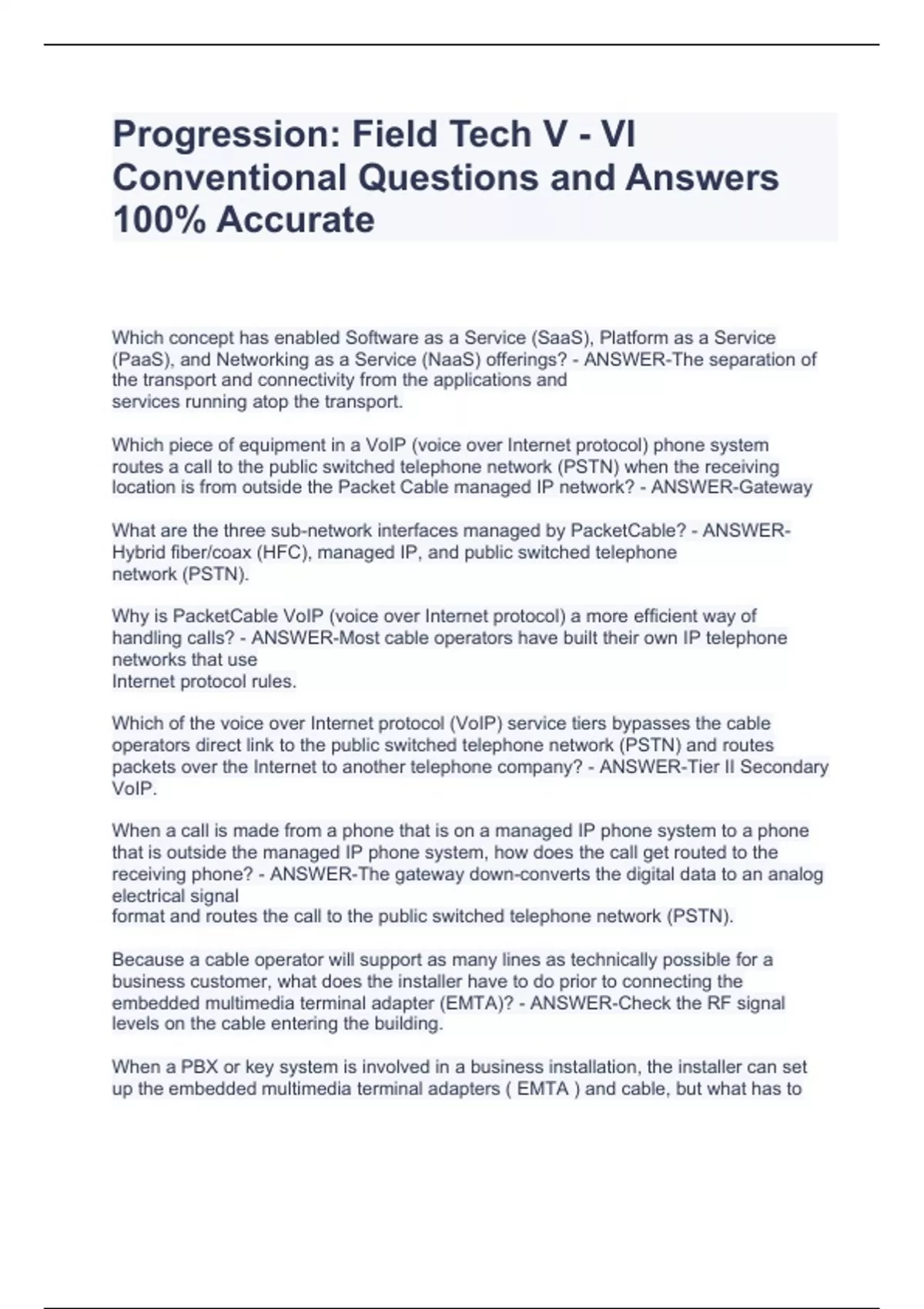 Progression: Field Tech V - VI Conventional Questions and Answers 100% AccurateProgression: Field Tech V - VI Conventional Questions and Answers 100% AccurateProgression: Field Tech V - VI Conventional Questions and Answers 100% AccurateWhich concept has enabled Software as a Service (SaaS), Platform as a Service (PaaS), and Networking as a Service (NaaS) offerings? - ANSWER-The separation of the transport and connectivity from the applications and services running atop the transport. Which piece of equipment in a VoIP (voice over Internet protocol) phone system routes a call to the public switched telephone network (PSTN) when the receiving location is from outside the Packet Cable managed IP network? - ANSWER-Gateway What are the three sub-network interfaces managed by PacketCable? - ANSWER-Hybrid fiber/coax (HFC), managed IP, and public switched telephone network (PSTN). Why is PacketCable VoIP (voice over Internet protocol) a more efficient way of handling calls? - ANSWER-Most cable operators have built their own IP telephone networks that use Internet protocol rules. Which of the voice over Internet protocol (VoIP) service tiers bypasses the cable operators direct link to the public switched telephone network (PSTN) and routes packets over the Internet to another telephone company? - ANSWER-Tier II Secondary VoIP. When a call is made from a phone that is on a managed IP phone system to a phone that is outside the managed IP phone system, how does the call get routed to the receiving phone? - ANSWER-The gateway down-converts the digital data to an analog electrical signal format and routes the call to the public switched telephone network (PSTN). Because a cable operator will support as many lines as technically possible for a business customer, what does the installer have to do prior to connecting the