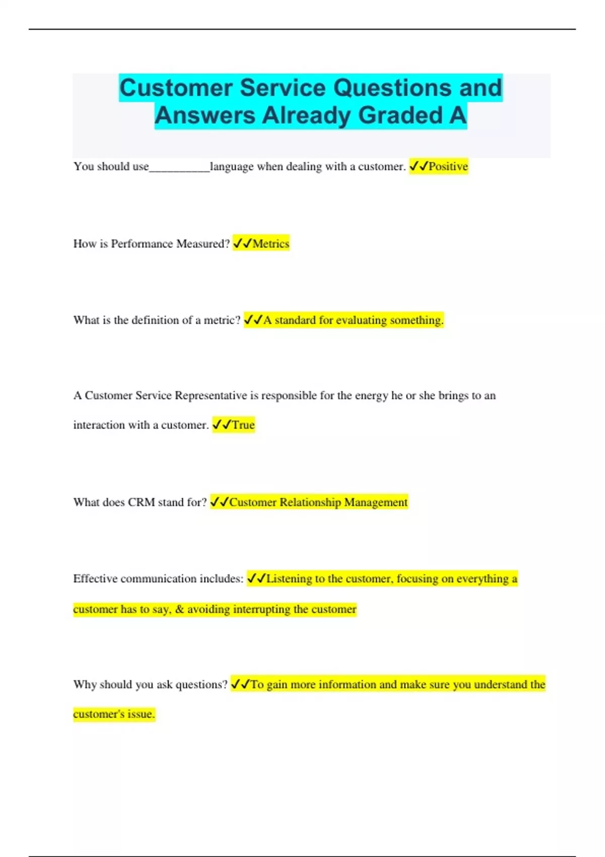 Customer Service Questions and Answers Already Graded A You should use__________language when dealing with a customer. Positive How is Performance Measured? Metrics What is the definition of a metric? A standard for evaluating something. A Customer Service Representative is responsible for the energy he or she brings to an interaction with a customer. True What does CRM stand for? Customer Relationship Management Effective communication includes: Listening to the customer, focusing on everything a customer has to say, & avoiding interrupting the customer Why should you ask questions? To gain more information and make sure you understand the customer's issue. If you can't give the customer exactly what they want, what should you do? Try to find a solution that works for both the customer and the company What can help you identify the root cause of the issue? Research You can show empathy by: Trying to view the problem from the customer's point of view If you know what the issue is, you do not need to restate the problem to the customer. False Why should you thank the customer after resolving the issue? To reassure the customer that the company values both them and their business A great attitude will help grow your relationship with customers. True What is NOT an example of a metric? Shoe type If you can't ask all the questions you'd like, you should ask as many questions as you can and make the best decision you can with the information you have. True Showing compassion when correcting an issue can help to mend the relationship: True What can it cost a company if a Customer Service Representative does not know how to do his or her job? Money & Customers Why should a Customer Service Representative follow through on promises he or she made? To help rebuild a customer's trust What is the first thing you should say to an upset customer? I apologize. Your technique for resolving a customer's issues should______________. Change based on the customer's needs Which of the following is a normal task of a Customer Service Representative? Coming to work on time What resources should a Customer Service Representative use to make difficult decisions? Company policy, culture, and common sense A CSR should not use email, newsletters, managers and other employees to stay current on information. False Which of the following are techniques for managing personal stress? Being in the moment, taking deep breaths & putting oneself in the customer's shoes How does the customer experience impact the company? It affects every area of the customer's relationship with the company.