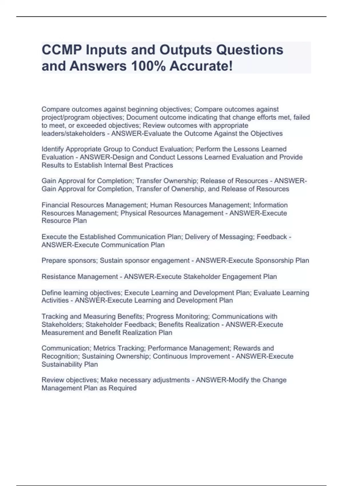 CCMP Inputs and Outputs Questions and Answers 100% Accurate! Compare outcomes against beginning objectives; Compare outcomes against project/program objectives; Document outcome indicating that change efforts met, failed to meet, or exceeded objectives; Review outcomes with appropriate leaders/stakeholders - ANSWER-Evaluate the Outcome Against the Objectives Identify Appropriate Group to Conduct Evaluation; Perform the Lessons Learned Evaluation - ANSWER-Design and Conduct Lessons Learned Evaluation and Provide Results to Establish Internal Best Practices Gain Approval for Completion; Transfer Ownership; Release of Resources - ANSWER-Gain Approval for Completion, Transfer of Ownership, and Release of Resources Financial Resources Management; Human Resources Management; Information Resources Management; Physical Resources Management - ANSWER-Execute Resource Plan Execute the Established Communication Plan; Delivery of Messaging; Feedback - ANSWER-Execute Communication Plan Prepare sponsors; Sustain sponsor engagement - ANSWER-Execute Sponsorship Plan Resistance Management - ANSWER-Execute Stakeholder Engagement Plan Define learning objectives; Execute Learning and Development Plan; Evaluate Learning Activities - ANSWER-Execute Learning and Development Plan Tracking and Measuring Benefits; Progress Monitoring; Communications with