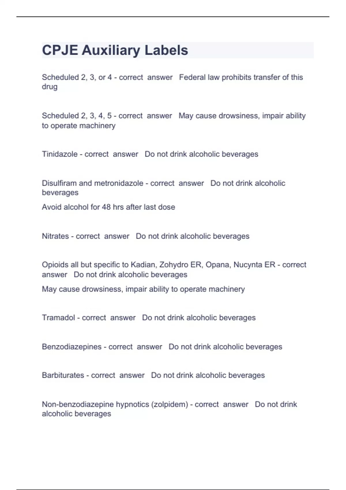 CPJE Auxiliary Labels Questions with complete solution 2023/2024Scheduled 2, 3, or 4 - correct answer Federal law prohibits transfer of this drug Scheduled 2, 3, 4, 5 - correct answer May cause drowsiness, impair ability to operate machinery Tinidazole - correct answer Do not drink alcoholic beverages Disulfiram and metronidazole - correct answer Do not drink alcoholic beverages Avoid alcohol for 48 hrs after last dose Nitrates - correct answer Do not drink alcoholic beverages