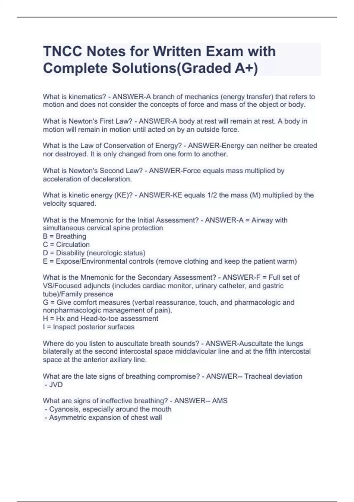 TNCC Notes for Written Exam with Complete Solutions(Graded A+) What is Newton's First Law? - ANSWER-A body at rest will remain at rest. A body in motion will remain in motion until acted on by an outside force. What is the Law of Conservation of Energy? - ANSWER-Energy can neither be created nor destroyed. It is only changed from one form to another. What is Newton's Second Law? - ANSWER-Force equals mass multiplied by acceleration of deceleration. What is kinetic energy (KE)? - ANSWER-KE equals 1/2 the mass (M) multiplied by the velocity squared. What is the Mnemonic for the Initial Assessment? - ANSWER-A = Airway with simultaneous cervical spine protection B = Breathing C = Circulation D = Disability (neurologic status) E = Expose/Environmental controls (remove clothing and keep the patient warm) What is the Mnemonic for the Secondary Assessment? - ANSWER-F = Full set of VS/Focused adjuncts (includes cardiac monitor, urinary catheter, and gastric tube)/Family presence G = Give comfort measures (verbal reassurance, touch, and pharmacologic and nonpharmacologic management of pain). H = Hx and Head-to-toe assessment I = Inspect posterior surfaces Where do you listen to auscultate breath sounds? - ANSWER-Auscultate the lungs bilaterally at the second intercostal space midclavicular line and at the fifth intercostal space at the anterior axillary line. What are the late signs of breathing compromise? - ANSWER-- Tracheal deviation - JVD