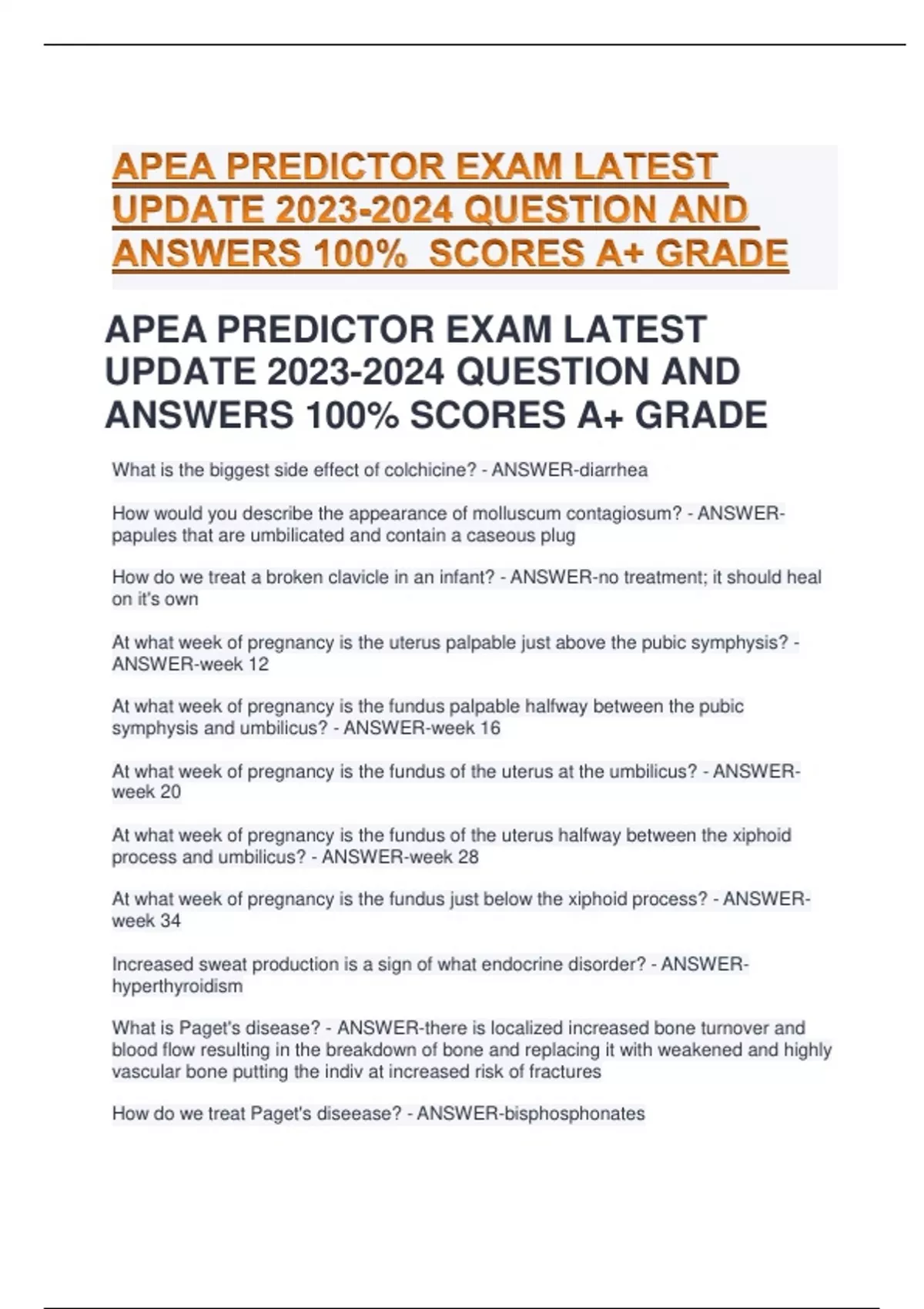 APEA PREDICTOR EXAM LATEST UPDATE QUESTION AND ANSWERS 100% SCORES A+ GRADE What is the biggest side effect of colchicine? - ANSWER-diarrhea How would you describe the appearance of molluscum contagiosum? - ANSWER- papules that are umbilicated and contain a caseous plug How do we treat a broken clavicle in an infant? - ANSWER-no treatment; it should heal on it's own At what week of pregnancy is the uterus palpable just above the pubic symphysis? - ANSWER-week 12 At what week of pregnancy is the fundus palpable halfway between the pubic symphysis and umbilicus? - ANSWER-week 16 At what week of pregnancy is the fundus of the uterus at the umbilicus? - ANSWER- week 20 At what week of pregnancy is the fundus of the uterus halfway between the xiphoid process and umbilicus? - ANSWER-week 28 At what week of pregnancy is the fundus just below the xiphoid process? - ANSWER- week 34 Increased sweat production is a sign of what endocrine disorder? - ANSWER- hyperthyroidism What is Paget's disease? - ANSWER-there is localized increased bone turnover and blood flow resulting in the breakdown of bone and replacing it with weakened and highly vascular bone putting the indiv at increased risk of fractures How do we treat Paget's diseease? - ANSWER-bisphosphonates How should pregnant women wear their seatbelt? - ANSWER-with the shoulder strap like a normal person and then the groin strap below the belly and across the hips What is another name for fifth disease? - ANSWER-parvovirus aka slapped cheek disease aka erythema infectiosum Which type of prevention are vaccinations? - ANSWER-primary