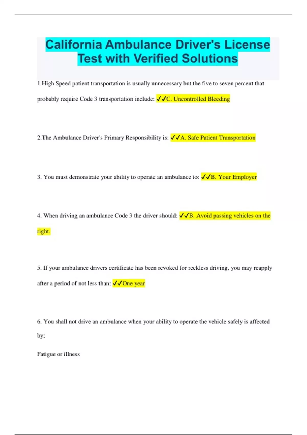 California Ambulance Driver's License Test with Verified Solutions