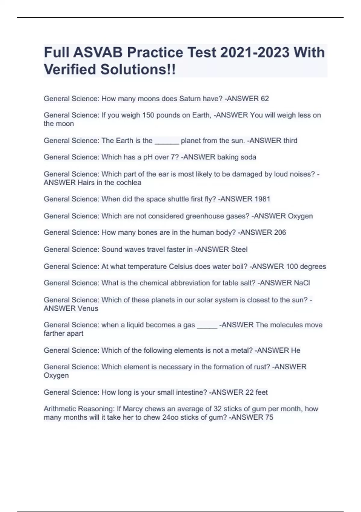 General Science: How many moons does Saturn have? -ANSWER 62 General Science: If you weigh 150 pounds on Earth, -ANSWER You will weigh less on the moon General Science: The Earth is the ______ planet from the sun. -ANSWER third General Science: Which has a pH over 7? -ANSWER baking soda General Science: Which part of the ear is most likely to be damaged by loud noises? -ANSWER Hairs in the cochlea General Science: When did the space shuttle first fly? -ANSWER 1981 General Science: Which are not considered greenhouse gases? -ANSWER Oxygen General Science: How many bones are in the human body? -ANSWER 206 General Science: Sound waves travel faster in -ANSWER Steel General Science: At what temperature Celsius does water boil? -ANSWER 100 degrees General Science: What is the chemical abbreviation for table salt? -ANSWER NaCl General Science: Which of these planets in our solar system is closest to the sun? -ANSWER Venus General Science: when a liquid becomes a gas _____ -ANSWER The molecules move farther apart General Science: Which of the following elements is not a metal? -ANSWER He General Science: Which element is necessary in the formation of rust? -ANSWER Oxygen General Science: How long is your small intestine? -ANSWER 22 feet Arithmetic Reasoning: If Marcy chews an average of 32 sticks of gum per month, how many months will it take her to chew 24oo sticks of gum? -ANSWER 75