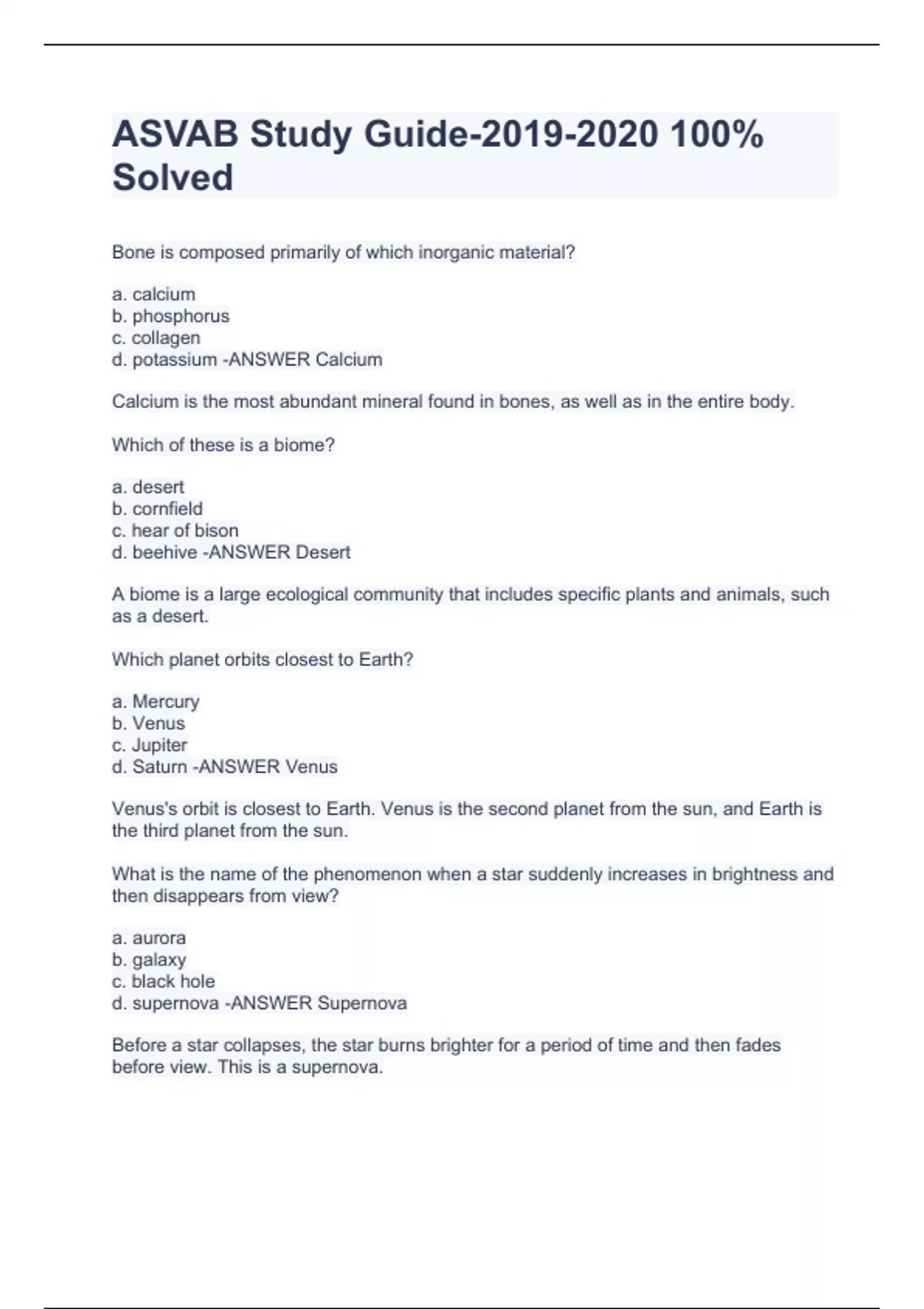 Bone is composed primarily of which inorganic material? a. calcium b. phosphorus c. collagen d. potassium -ANSWER Calcium Calcium is the most abundant mineral found in bones, as well as in the entire body. Which of these is a biome? a. desert b. cornfield c. hear of bison d. beehive -ANSWER Desert A biome is a large ecological community that includes specific plants and animals, such as a desert. Which planet orbits closest to Earth? a. Mercury b. Venus c. Jupiter d. Saturn -ANSWER Venus Venus's orbit is closest to Earth. Venus is the second planet from the sun, and Earth is the third planet from the sun. What is the name of the phenomenon when a star suddenly increases in brightness and then disappears from view? a. aurora b. galaxy c. black hole d. supernova -ANSWER Supernova Before a star collapses, the star burns brighter for a period of time and then fades before view. This is a supernova. Which organism has cells that contain mitochondria? a. whale b. mushroom c. tulip d. all of the above -ANSWER All of the above Plant, animal, and fungi cells have mitochondria. Isotopes of an element will have the same number of _______ and different numbers of ________? a. electrons; neutrons b. neutrons; electrons c. protons; neutrons d. protons; electrons -ANSWER Protons; neutrons Isotopes are atoms of the same element with the same number of protons but different number