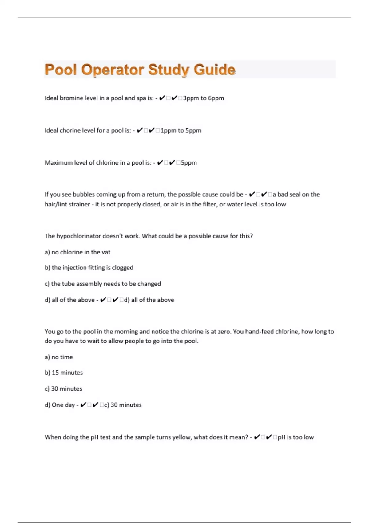 Ideal bromine level in a pool and spa is: - ️️3ppm to 6ppm Ideal chorine level for a pool is: - ️️1ppm to 5ppm Maximum level of chlorine in a pool is: - ️️5ppm If you see bubbles coming up from a return, the possible cause could be - ️️a bad seal on the hair/lint strainer - it is not properly closed, or air is in the filter, or water level is too low The hypochlorinator doesn't work. What could be a possible cause for this? a) no chlorine in the vat b) the injection fitting is clogged c) the tube assembly needs to be changed d) all of the above - ️️d) all of the above You go to the pool in the morning and notice the chlorine is at zero. You hand-feed chlorine, how long to do you have to wait to allow people to go into the pool. a) no time b) 15 minutes c) 30 minutes d) One day - ️️c) 30 minutes When doing the pH test and the sample turns yellow, what does it mean? - ️️pH is too low