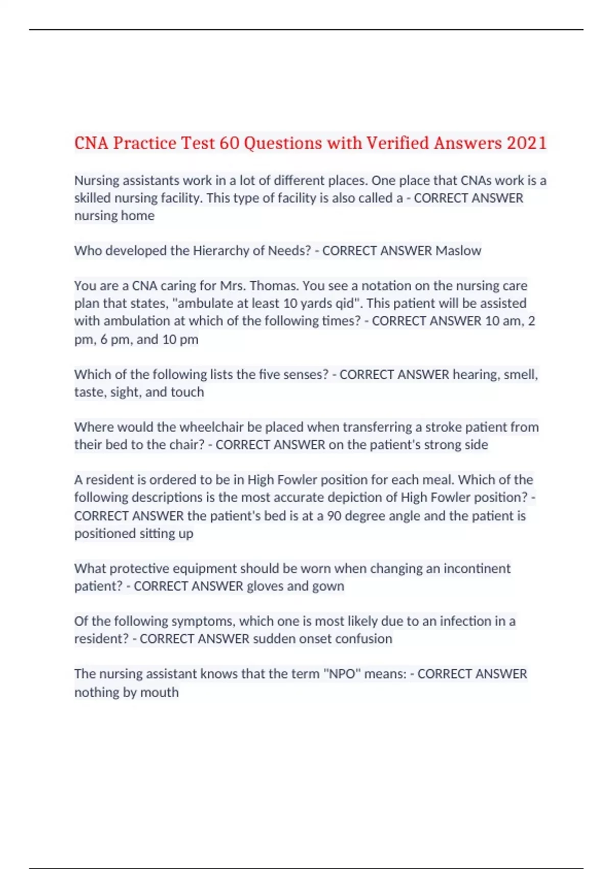 CNA Practice Test 60 Questions with Verified Answers 2021 Nursing assistants work in a lot of different places. One place that CNAs work is a skilled nursing facility. This type of facility is also called a - CORRECT ANSWER nursing home Who developed the Hierarchy of Needs? - CORRECT ANSWER Maslow You are a CNA caring for Mrs. Thomas. You see a notation on the nursing care plan that states, "ambulate at least 10 yards qid". This patient will be assisted with ambulation at which of the following times? - CORRECT ANSWER 10 am, 2 pm, 6 pm, and 10 pm Which of the following lists the five senses? - CORRECT ANSWER hearing, smell, taste, sight, and touch Where would the wheelchair be placed when transferring a stroke patient from their bed to the chair? - CORRECT ANSWER on the patient's strong side A resident is ordered to be in High Fowler position for each meal. Which of the following descriptions is the most accurate depiction of High Fowler position? - CORRECT ANSWER the patient's bed is at a 90 degree angle and the patient is positioned sitting up What protective equipment should be worn when changing an incontinent patient? - CORRECT ANSWER gloves and gown Of the following symptoms, which one is most likely due to an infection in a resident? - CORRECT ANSWER sudden onset confusion The nursing assistant knows that the term "NPO" means: - CORRECT ANSWER nothing by mouth The nursing assistant should tell the nurse if the client with diabetes: - CORRECT ANSWER does not touch their lunch tray The nursing assistant knows that residents on bedrest must be turned ever: - CORRECT ANSWER 2 hours Which of the following pulses will be most commonly used by a nursing assistant when acquiring vital signs? - CORRECT ANSWER radial The nursing assistant is helping residents to eat in the dining room when, suddenly, a resident stands from their seat and begins clutching their throat while coughing silently. The nursing assistant performs which of the following actions first? - CORRECT ANSWER ask the resident if they are choking A client at the facility receives a new roommate. While the roommate is in the bathroom, the clients leans towards the nurse and whispers, "Why is she here anyway? Is she sick?" The best response by the nursing assistant is: - CORRECT ANSWER "I'm afraid I can't share that information with you." A client with Alzheimer's wakes up more confused than usual one morning. The nursing assistant know that, after breakfast, it is most important to support normal gastrointestinal tract function by: - CORRECT ANSWER taking the client to the bathroom The client asks the nursing assistant to assist her to cut her toenails. The nursing assistant knows the client has type two diabetes. Which of the following actions is best? - CORRECT ANSWER check the chart for physician orders regarding nail trimming Which of the following options is the best method to prevent insomnia? - CORRECT ANSWER encourage the client to take several walks around the facility daily The nursing assistant takes the temperature of an elderly client and finds it to be 100.6 degrees F. The client reports having just taken a sip of hot tea. Which of the following actions is appropriate? - CORRECT ANSWER the nursing assistants waits at least fifteen minutes before taking the temperature A client under the nursing assistant's care suffers from chronic "foot drop". The nursing assistant can expect to find which of the following devices in the client's room? - CORRECT ANSWER positioning boots A nursing assistant takes the blood pressure of a client and finds it to be 82/43. The client reports feeling dizzy. The nursing assistant should: - CORRECT ANSWER report the finding to the nurse The range of motion term "abduction" means: - CORRECT ANSWER moving the extremity away from the body Which of the following most addresses a client's needs in regard to spirituality? - CORRECT ANSWER assist the client to the facility's chapel every Sunday Proper body mechanics when lifting clients involve which of the following? - CORRECT ANSWER bending at the knees Which of the following would be primary indication of hepatitis? - CORRECT ANSWER jaundice Which of the following aspects of care is important for a confused client? - CORRECT ANSWER reorienting the client frequently What type of client may opt to receive hospice care? - CORRECT ANSWER terminally ill client Cheyne-Stokes respirations occur in a client who: - CORRECT ANSWER is close to death A client in the day room is having a panic attack. The nursing assistant should: - CORRECT ANSWER tell the client to breathe as slowly and deeply as possible Which of the following residents is demonstrating orthopneic position? - CORRECT ANSWER a resident sits on its side of the bed and leans forward over a bedside table A resident is choosing items for breakfast. Which of the following items contains the most amount of potassium? - CORRECT ANSWER cantaloupe When helping a client with left-sided weakness due to CVA, the nursing assistant should position the client's cane: - CORRECT ANSWER on the right side CPR (Cardiopulmonary resuscitation) should be performed when: - CORRECT ANSWER a client has no pulse and is not breathing A nursing assistant enters a client's room and finds a fire burning in a trashcan. The nursing assistant's first action is to: - CORRECT ANSWER remove the patient "Log-rolling" is a technique best used for which of the following patient diagnosis? - CORRECT ANSWER spinal cord injury (SCI) When a client constantly ignores the urge to void, the client is putting themselves in danger of what complication - CORRECT ANSWER incontinence Which of the following types of grief is considered a normal and healthy part of grieving? - CORRECT ANSWER anticipatory A patient is on clear liquid diet. Which of the following is NOT allowed on this diet? - CORRECT ANSWER orange juice with pulp A client with a Foley catheter is ordered to ambulate twice daily. Before ambulating the client, the nursing a