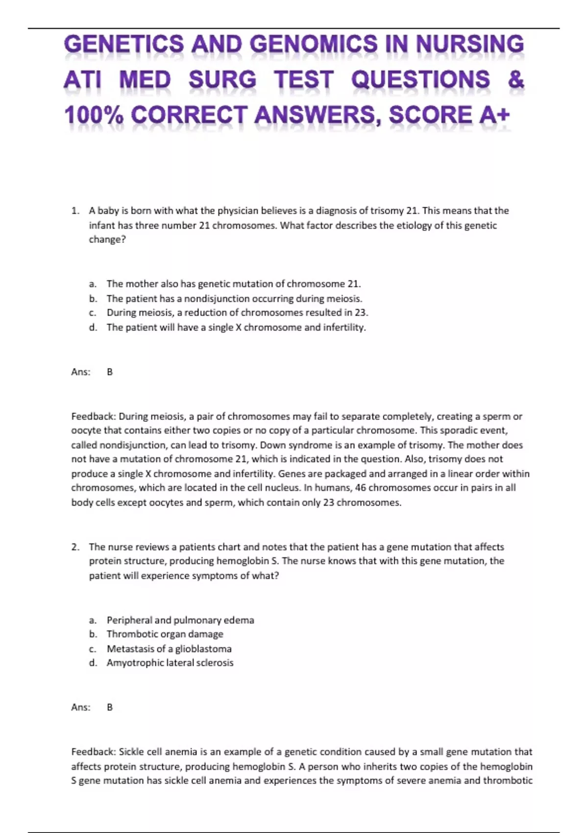 GENETICS AND GENOMICS IN NURSING ATI MED SURG TEST QUESTIONS & 100% CORRECT ANSWERS, SCORE A+ GENETICS AND GENOMICS IN NURSING ATI MED SURG TEST QUESTIONS & 100% CORRECT ANSWERS, SCORE A+ 1. A baby is born with what the physician believes is a diagnosis of trisomy 21. This means that the infant has three number 21 chromosomes. What factor describes the etiology of this genetic change? a. The mother also has genetic mutation of chromosome 21. b. The patient has a nondisjunction occurring during meiosis. c. During meiosis, a reduction of chromosomes resulted in 23. d. The patient will have a single X chromosome and infertility. Ans: B Feedback: During meiosis, a pair of chromosomes may fail to separate completely, creating a sperm or oocyte that contains either two copies or no copy of a particular chromosome. This sporadic event, called nondisjunction, can lead to trisomy. Down syndrome is an example of trisomy. The mother does not have a mutation of chromosome 21, which is indicated in the question. Also, trisomy does not produce a single X chromosome and infertility. Genes are packaged and arranged in a linear order within chromosomes, which are located in the cell nucleus. In humans, 46 chromosomes occur in pairs in all body cells except oocytes and sperm, which contain only 23 chromosomes. 2. The nurse reviews a patients chart and notes that the patient has a gene mutation that affects protein structure, producing hemoglobin S. The nurse knows that with this gene mutation, the patient will experience symptoms of what? a. Peripheral and pulmonary edema b. Thrombotic organ damage c. Metastasis of a glioblastoma d. Amyotrophic lateral sclerosis Ans: B Feedback: Sickle cell anemia is an example of a genetic condition caused by a small gene mutation that affects protein structure, producing hemoglobin S. A person who inherits two copies of the hemoglobin S gene mutation has sickle cell anemia and experiences the symptoms of severe anemia and thrombotic organ damage resulting in hypoxia. Amyotrophic lateral sclerosis is a neurodegenerative disease that can occur as a result of an inherited mutation, but not a mutation of hemoglobin S. The patient with sickle cell anemia may experience edema, but it would not be related to the gene mutation. A glioblastoma is a neurologic tumor. 3. During the admission assessment, the nurse notes many caf-au-lait spots on the patients trunk, back, neck, and legs and suspects that the patient has neurofibromatosis. Based on the nurses knowledge of neurofibromatosis, the nurse understands that a single family member has which of the following? a. A spontaneous mutation b. A germline mutation c. A nondisjunction d. A monosomy Ans: A Feedback: Spontaneous mutations take place in individual oocytes or sperm at the time of conception. These mutations are not inherited in other family members. However, a person who carries the new spontaneous mutation may pass on the mutation to his or her children. Achondroplasia, Marfan syndrome, and neurofibromatosis type 1 are examples of genetic conditions that may occur in a single family member as a result of spontaneous mutation. Germline mutations are passed on to all daughter cells when body cells replicate. During meiosis, a pair of chromosomes may fail to separate completely, creating a sperm or oocyte that contains two copies or no copy of a particular chromosome. This sporadic event, called nondisjunction, can lead to either trisomy or a monosomy. 4. A 45-year-old man has just been diagnosed with Huntington disease. He and his wife are concerned about their four children. What will the nurse understand about the childrens possibility of inheriting the gene for the disease? a. Each child will have a 25% chance of inheriting the disease. b. Each child will have a 50% chance of inheriting the disease. c. Each child will have a 75% chance of inheriting the disease. d. Each child will have no chance of inheriting the disease. Ans: B Feedback: Huntington disease is an autosomal dominant disorder. Autosomal dominant inherited conditions affect female and male family members equally and follow a vertical pattern of inheritance in families. A person who has an autosomal dominant inherited condition carries a gene mutation for that condition on one chromosome pair. Each of that persons offspring has a 50% chance of inheriting the gene mutation for the condition and a 50% chance of inheriting the normal version of the gene. 5. A young woman and her husband want to start a family. The young woman explains to the nurse that she had a retinoblastoma as a child. The woman and her husband are concerned about the chances of their son or daughter developing a retinoblastoma. What is important for the nurse to explain to the couple? a. Retinoblastoma is an autosomal recessive inheritance in which each parent carries the gene mutation. b. Retinoblastoma is an X-linked inheritance and all males inherit an X chromosome from their mothers. c. Retinoblastoma is an autosomal dominant inheritance that has incomplete penetrance and can skip a generation. d. Retinoblastoma is a pattern that is more horizontal than vertical; relatives of a single generation tend to have the condition. Ans: C Feedback: Retinoblastoma is an autosomal dominant inheritance that has incomplete penetrance, and the gene appears to skip a generation, thus leading to errors in interpreting family history and in genetic counseling. Autosomal recessive conditions have a pattern that is more horizontal than vertical; relatives of a single generation tend to have the condition. Genetic conditions inherited in an autosomal recessive pattern are frequently seen among particular ethnic groups and usually occur more often in children of parents who are related by blood, such as first cousins. X-linked conditions may be inherited in recessive or dominant patterns. In both, the gene mutation is located on the X chromosome. 6. A 47-year-old patient with osteoarthritis and hypertensi