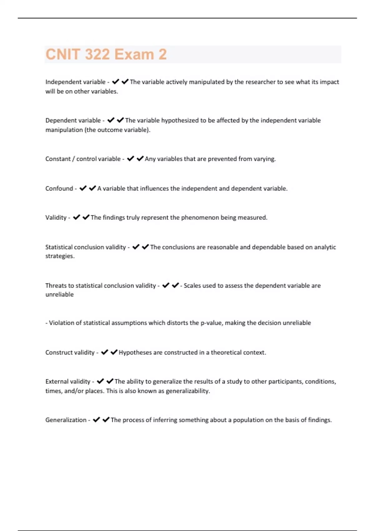 Independent variable - The variable actively manipulated by the researcher to see what its impact will be on other variables. Dependent variable - The variable hypothesized to be affected by the independent variable manipulation (the outcome variable). Constant / control variable - Any variables that are prevented from varying. Confound - A variable that influences the independent and dependent variable. Validity - The findings truly represent the phenomenon being measured. Statistical conclusion validity - The conclusions are reasonable and dependable based on analytic strategies. Threats to statistical conclusion validity - - Scales used to assess the dependent variable are unreliable - Violation of statistical assumptions which distorts the p-value, making the decision unreliable Construct validity - Hypotheses are constructed in a theoretical context. External validity - The ability to generalize the results of a study to other participants, conditions, times, and/or places. This is also known as generalizability. Generalization - The process of inferring something about a population on the basis of findings.Internal validity - The ability of experiments to strengthen the logical rigor of a causal explanation between the independent variable and dependent variable by eliminating plausible alternate explanations (PAEs). Threats to validity - - Selection (groups are not equivalent) - History (something occurs that effects the dependent variable) - Maturation (natural process of growth) - Testing (process of being measured in a pretest impacts the dependent variable) - Instrumentation (scale/treatment changes or is not stable) - Experimental mortality (attrition) - Statistical regression (extreme values tend to move toward the average) - Sequence/order of events - Diffusion of treatment - Experimenter expectancy - Demand characteristics (reactivity) Ecological validity - Refers to whether the results generalize from the laboratory to the real world.