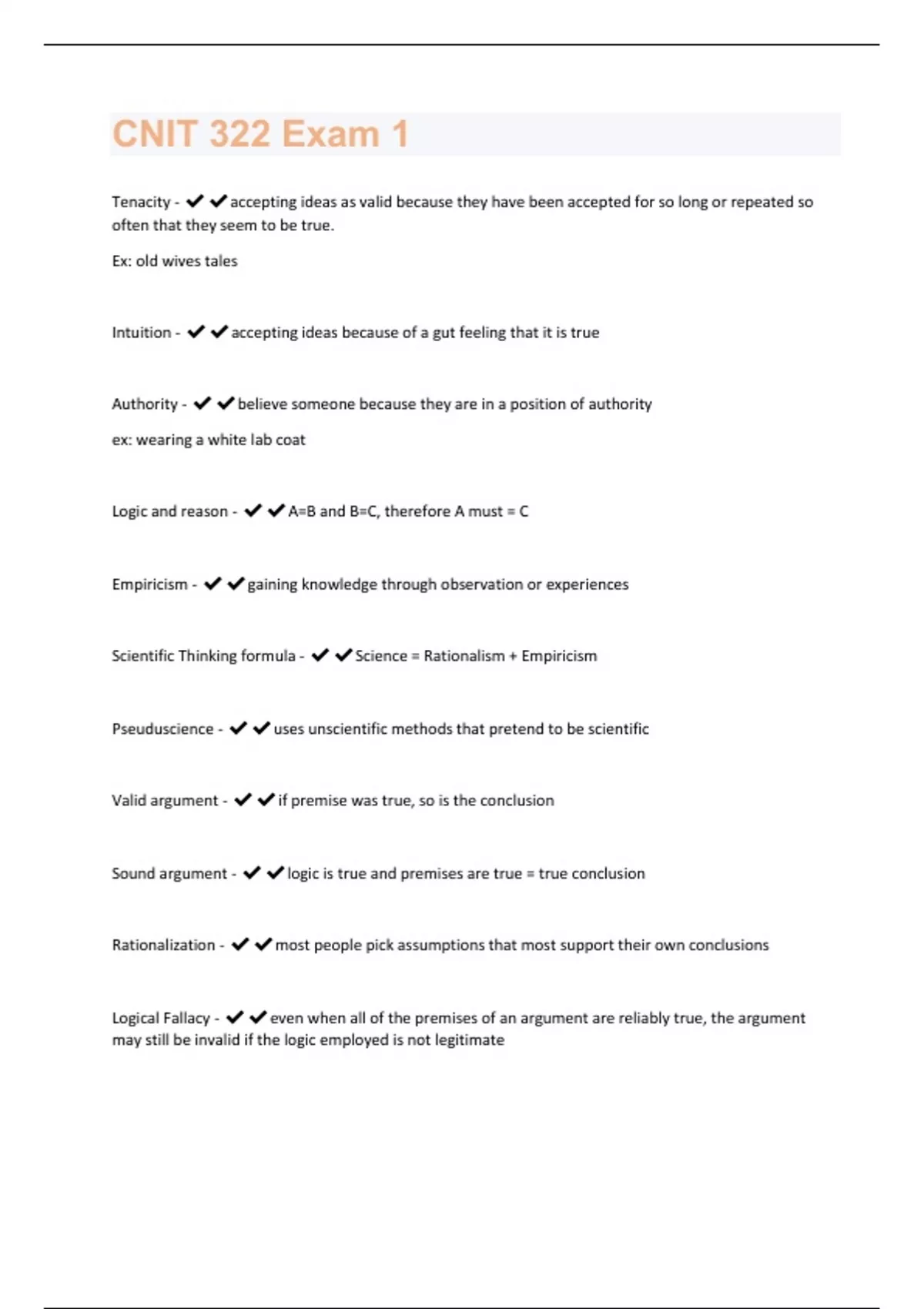 Tenacity - accepting ideas as valid because they have been accepted for so long or repeated so often that they seem to be true. Ex: old wives tales Intuition - accepting ideas because of a gut feeling that it is true Authority - believe someone because they are in a position of authority ex: wearing a white lab coat Logic and reason - A=B and B=C, therefore A must = C Empiricism - gaining knowledge through observation or experiences Scientific Thinking formula - Science = Rationalism + Empiricism Pseuduscience - uses unscientific methods that pretend to be scientific Valid argument - if premise was true, so is the conclusion Sound argument - logic is true and premises are true = true conclusion Rationalization - most people pick assumptions that most support their own conclusions Logical Fallacy - even when all of the premises of an argument are reliably true, the argument may still be invalid if the logic employed is not legitimateHeuristics - Short cuts, true most of the time Ad hominem - attack someone's personal character Straw man - Attempts to counter a position by attacking a different person Argument from Authority - tempts us to agree with the writer's assumptions based on the authority of a famous person or entity or on his or her own character