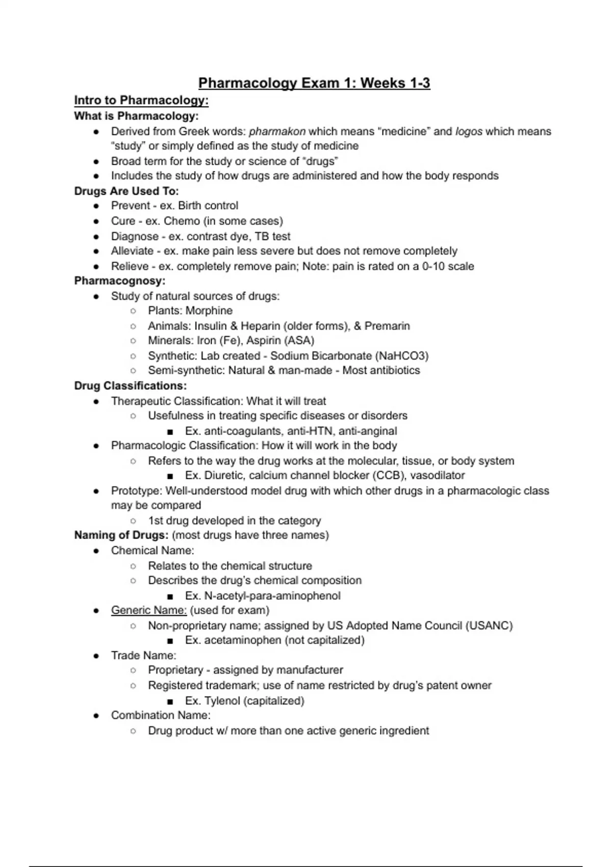 HSC MISC Pharmacology Exam 1: Weeks 1-3 2023- Florida International University Intro to Pharmacology: What is Pharmacology: ● Derived from Greek words: pharmakon which means “medicine” and logos which means “study” or simply defined as the study of medicine ● Broad term for the study or science of “drugs” ● Includes the study of how drugs are administered and how the body responds Drugs Are Used To: ● Prevent - ex. Birth control ● Cure - ex. Chemo (in some cases) ● Diagnose - ex. contrast dye, TB test ● Alleviate - ex. make pain less severe but does not remove completely ● Relieve - ex. completely remove pain; Note: pain is rated on a 0-10 scale Pharmacognosy: ● Study of natural sources of drugs: ○ Plants: Morphine ○ Animals: Insulin & Heparin (older forms), & Premarin ○ Minerals: Iron (Fe), Aspirin (ASA) ○ Synthetic: Lab created - Sodium Bicarbonate (NaHCO3) ○ Semi-synthetic: Natural & man-made - Most antibiotics Drug Classifications: ● Therapeutic Classification: What it will treat ○ Usefulness in treating specific diseases or disorders ■ Ex. anti-coagulants, anti-HTN, anti-anginal ● Pharmacologic Classification: How it will work in the body ○ Refers to the way the drug works at the molecular, tissue, or body system ■ Ex. Diuretic, calcium channel blocker (CCB), vasodilator ● Prototype: Well-understood model drug with which other drugs in a pharmacologic class may be compared ○ 1st drug developed in the category Naming of Drugs: (most drugs have three names) ● Chemical Name: ○ Relates to the chemical structure ○ Describes the drug’s chemical composition ■ Ex. N-acetyl-para-aminophenol ● Generic Name: (used for exam) ○ Non-proprietary name; assigned by US Adopted Name Council (USANC) ■ Ex. acetaminophen (not capitalized) ● Trade Name: ○ Proprietary - assigned by manufacturer ○ Registered trademark; use of name restricted by drug’s patent owner ■ Ex. Tylenol (capitalized) ● Combination Name: ○ Drug product w/ more than one active generic ingredient Regulatory Acts, Standards, and Organizations: ● Was not mentioned in LES. Review on ppt slide. FDA Drug Approval Process: ● Phase I - Preclinical Investigation (HEALTHY PATIENTS) ○ Side effects & Occurrence ● Phase II - Clinical Investigation (HEALTHY & SICK (PLACEBO+DRUG)) ○ Longest part; small clinical test group ● Phase III - Review of New Drug Application (NDA) ○ 17-24 months; FDA reviews info from Phase 2 ● Phase IV - Post-Marketing Surveillance ○ FDA approved; see side effects within population & recall if necessary Schedule for Controlled Substances: ● Schedules 1, 2, 3 mentioned in LES ***Know the abuse potential*** . . . . . . . . . .