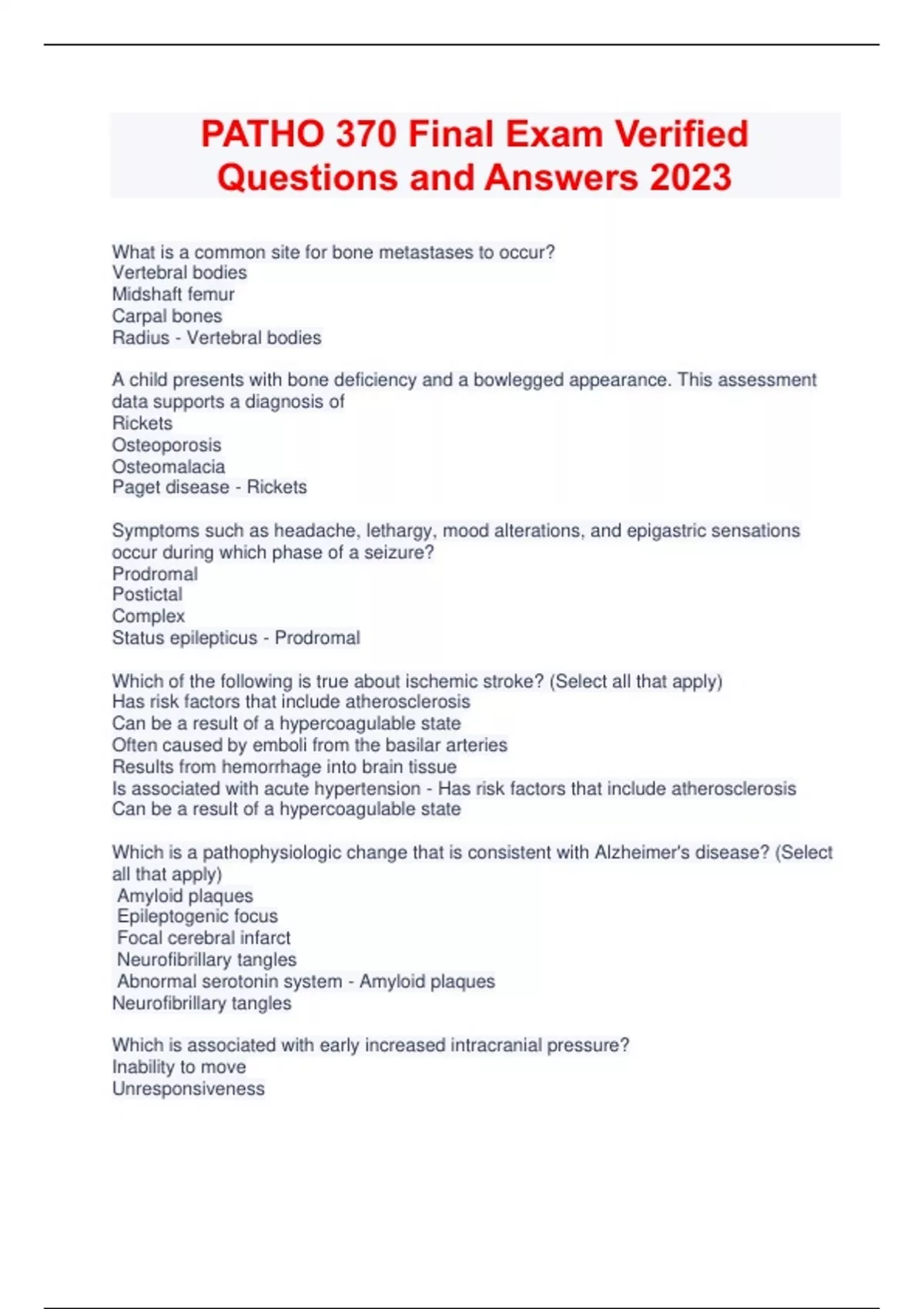 PATHO 370 Final Exam Verified Questions and Answers 2023