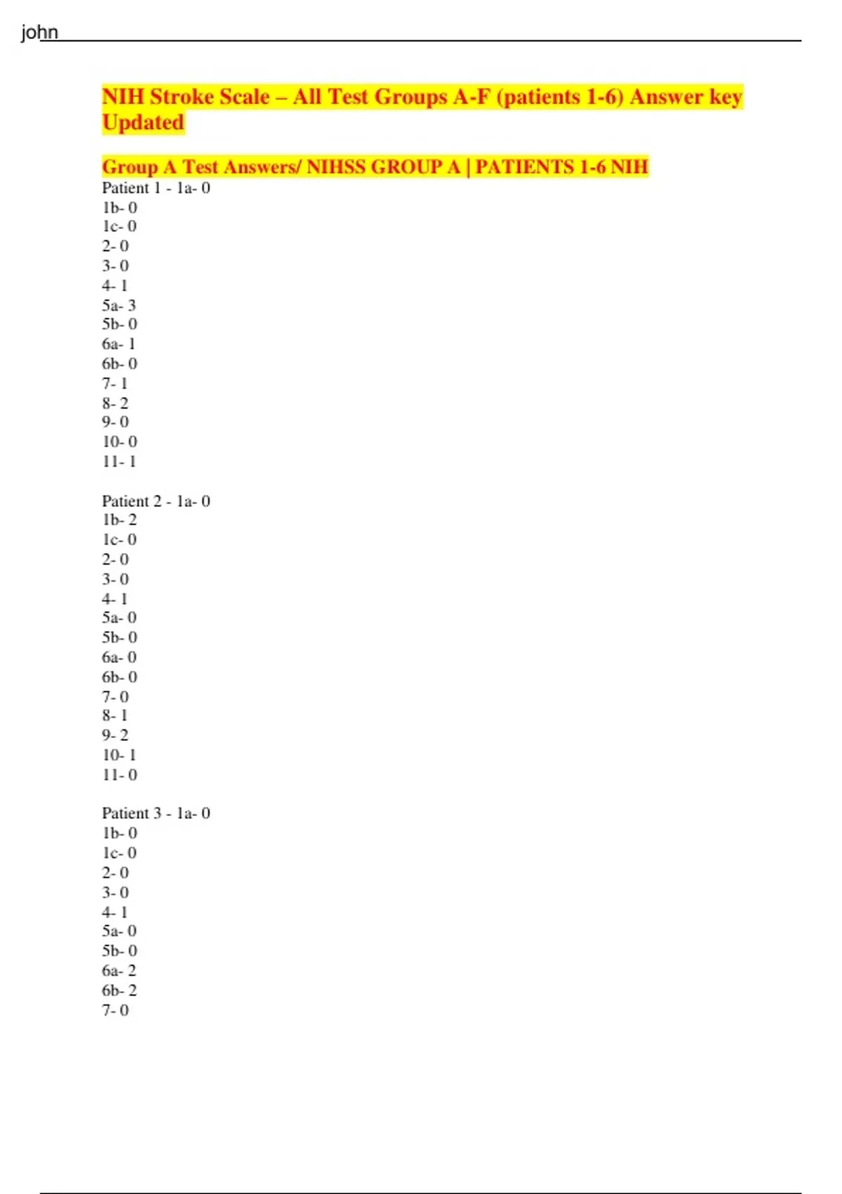 Group A Test Answers/ NIHSS GROUP A | PATIENTS 1-6 NIH